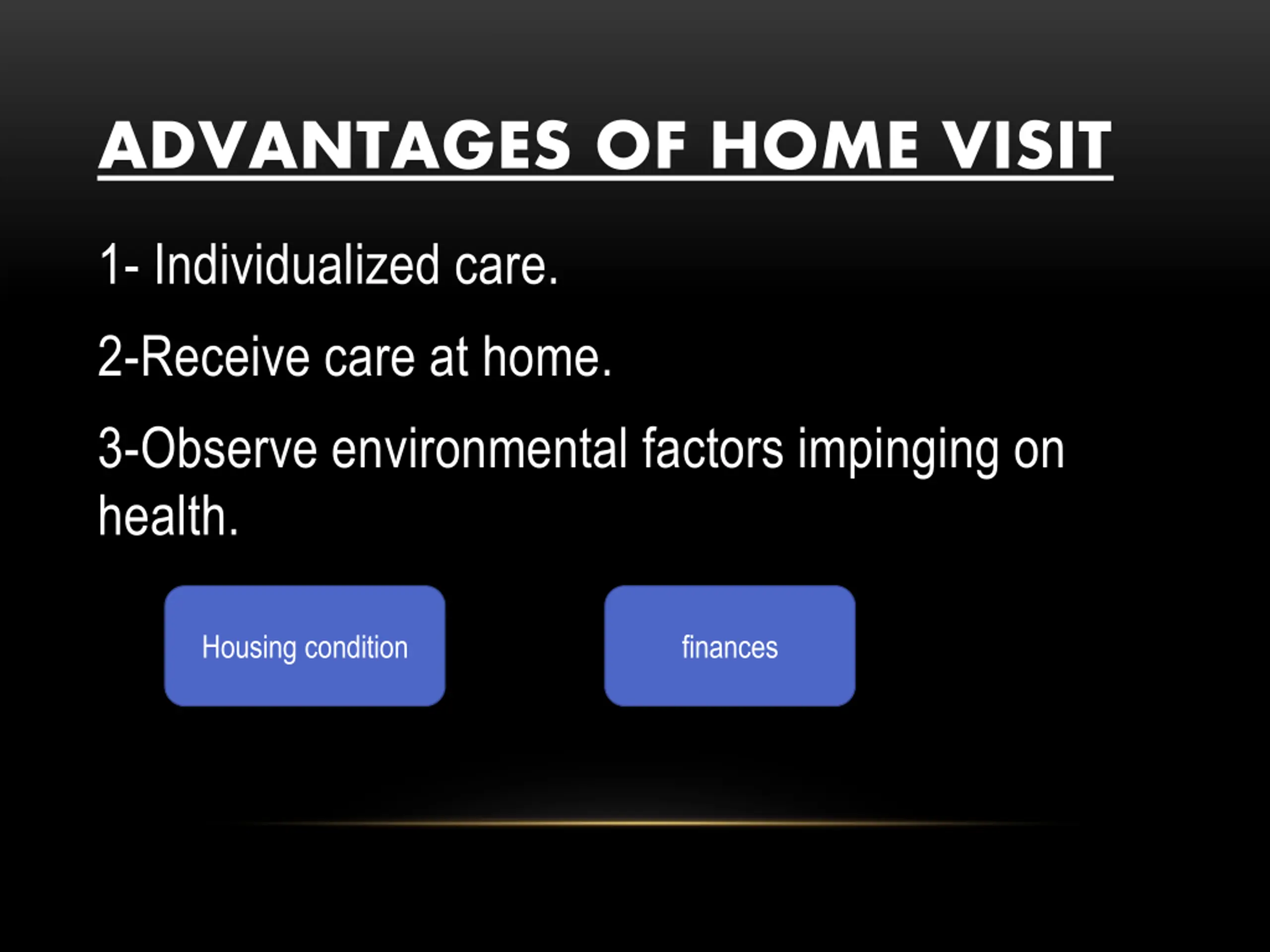 ADVANTAGES OF HOME VISIT 1- Individualized care. 2-Receive care at home. 3-Observe environmental factors impinging on health. Housing condition finances 4 Understanding lifestyle