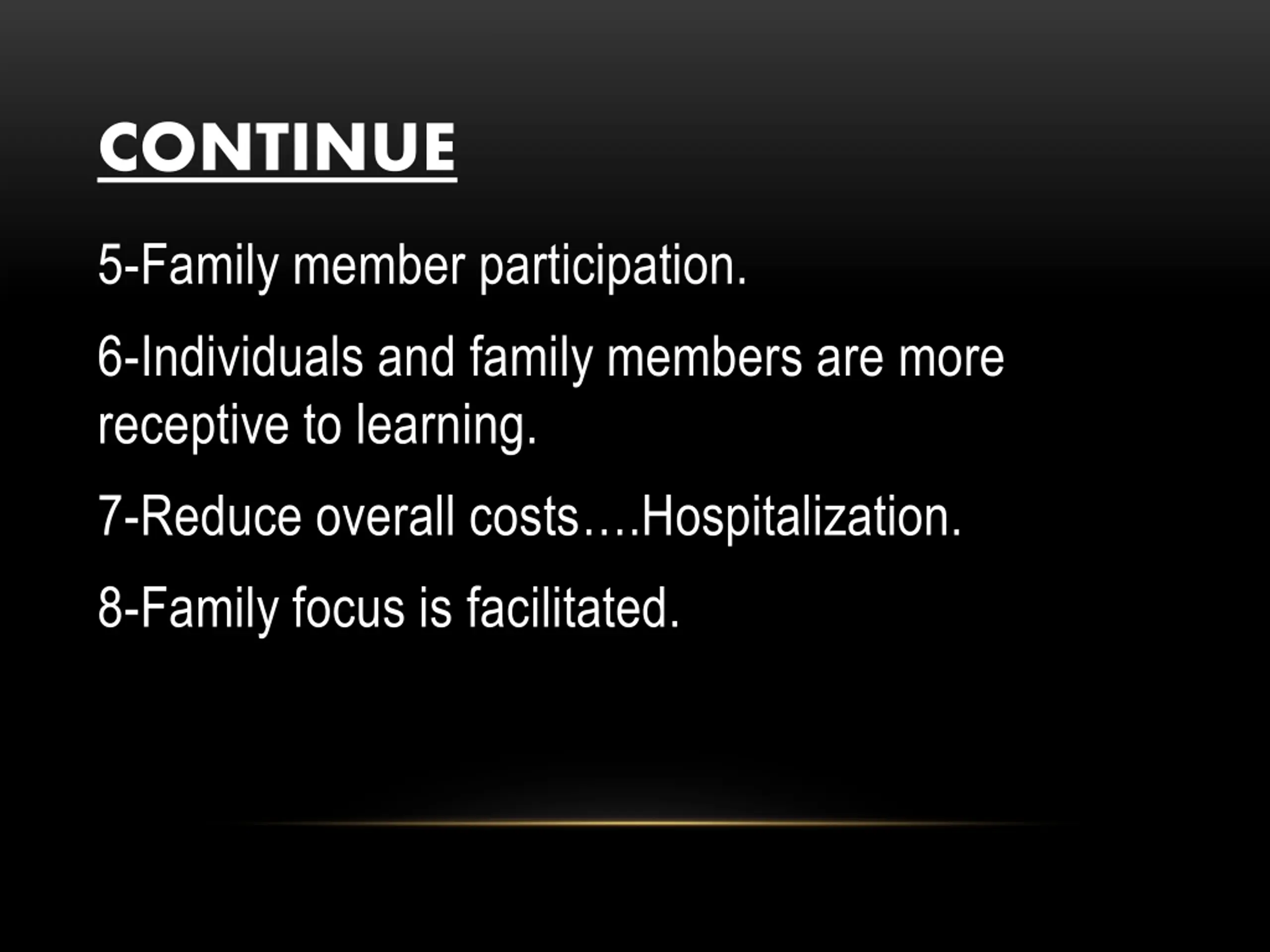 CONTINUE 5-Family member participation. 6-Individuals and family members are more receptive to learning. 7-Reduce overall costs .Hospitalization. 8-Family focus is facilitated.