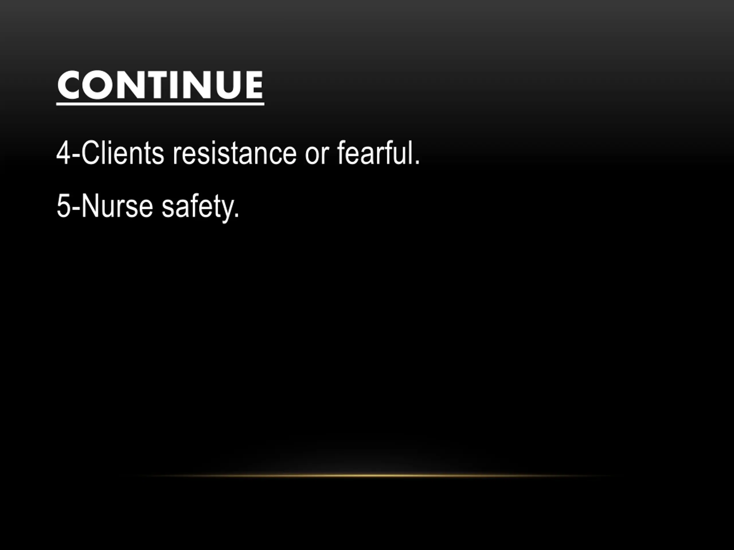 CONTINUE 4-Clients resistance or fearful. 5-Nurse safety.