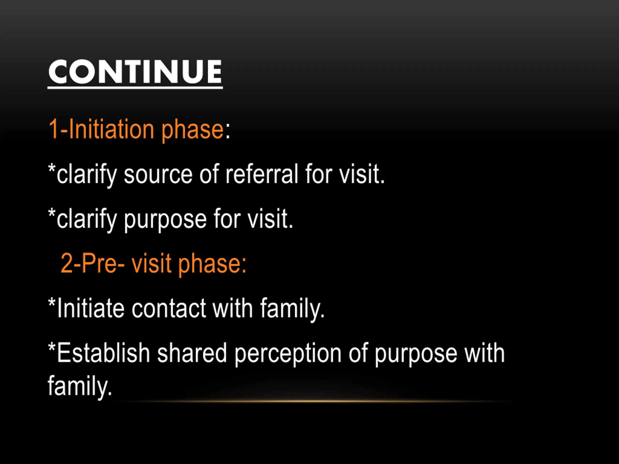 CONTINUE 1-Initiation phase: *clarify source of referral for visit. *clarify purpose for visit. 2-Pre- visit phase: *Initiate contact with family. *Establish shared perception of purpose with family.