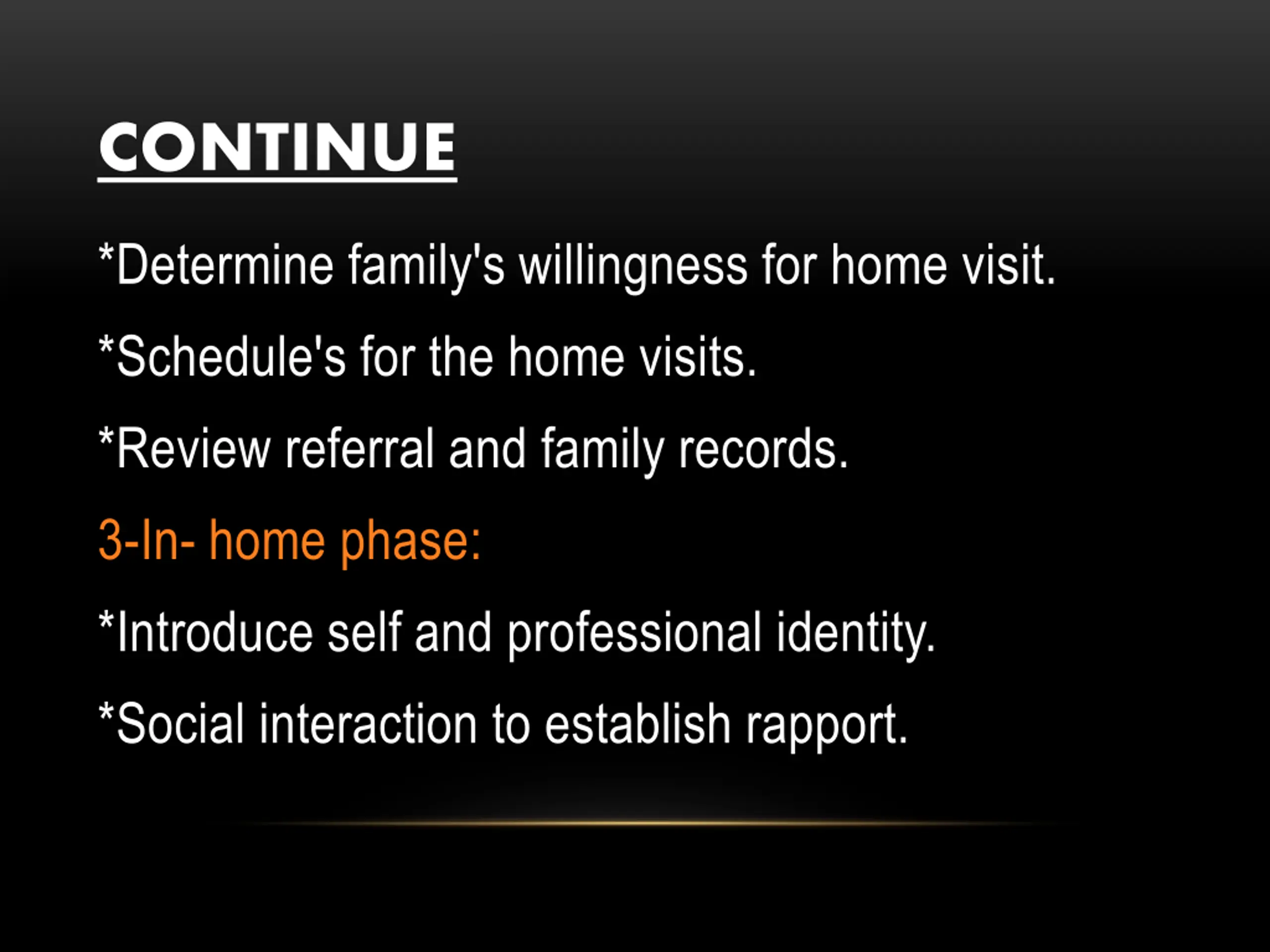 CONTINUE *Determine family's willingness for home visit. *Schedule's for the home visits. *Review referral and family records. 3-In- home phase: *Introduce self and professional identity. *Social interaction to establish rapport.