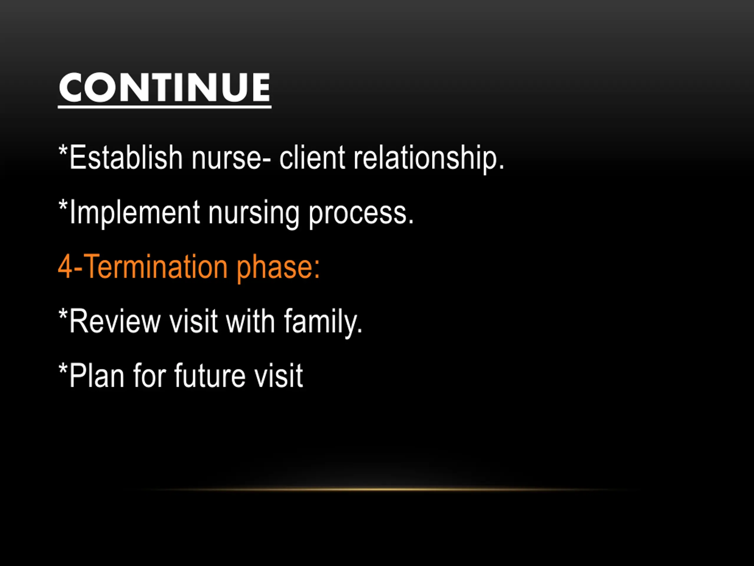 CONTINUE *Establish nurse- client relationship. *Implement nursing process. 4-Termination phase: *Review visit with family. *Plan for future visit