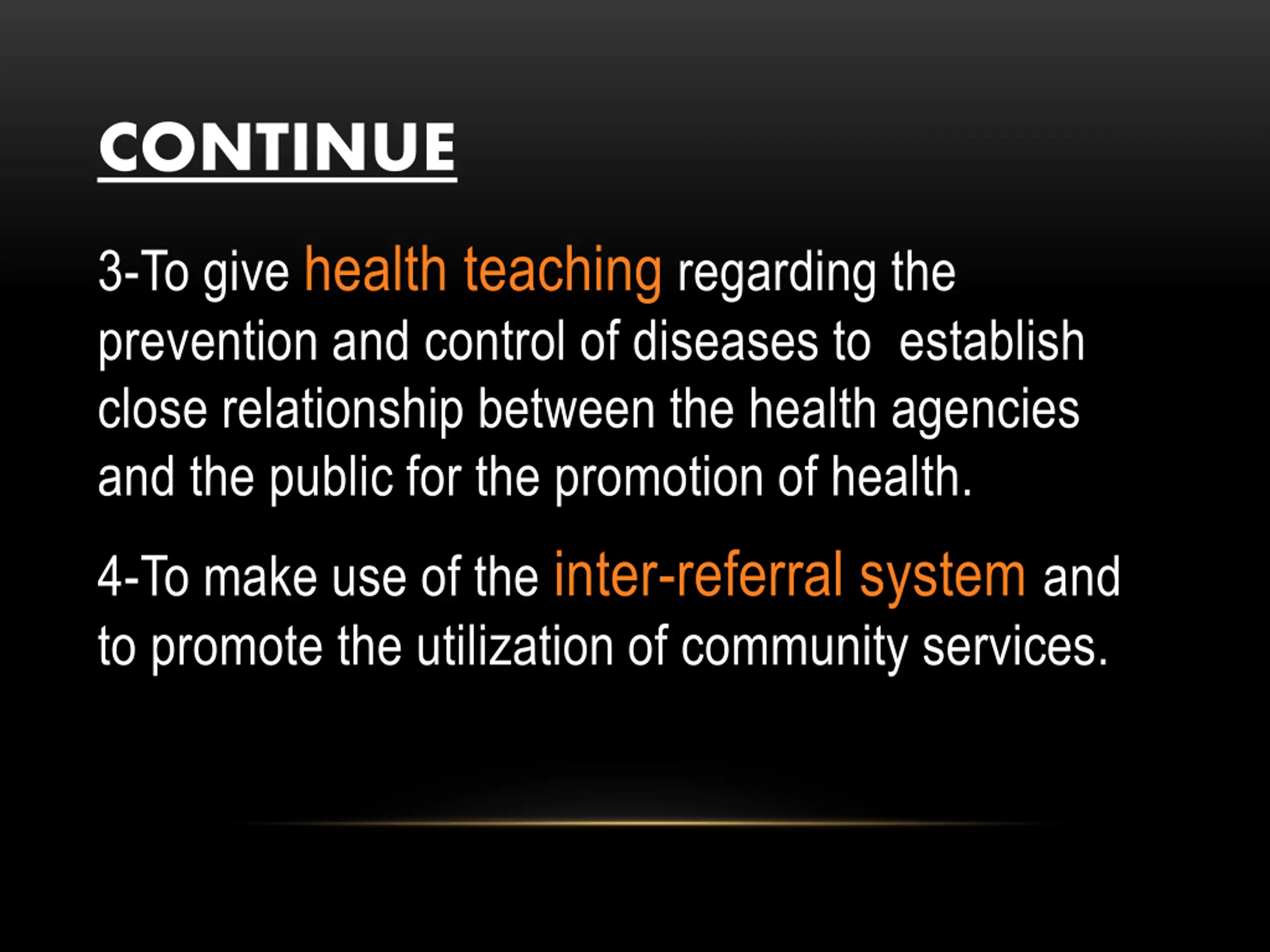 CONTINUE 3-To give health teaching regarding the prevention and control of diseases to establish close relationship between the health agencies and the public for the promotion of health. 4-To make use of the inter-referral system and to promote the utilization of community services.