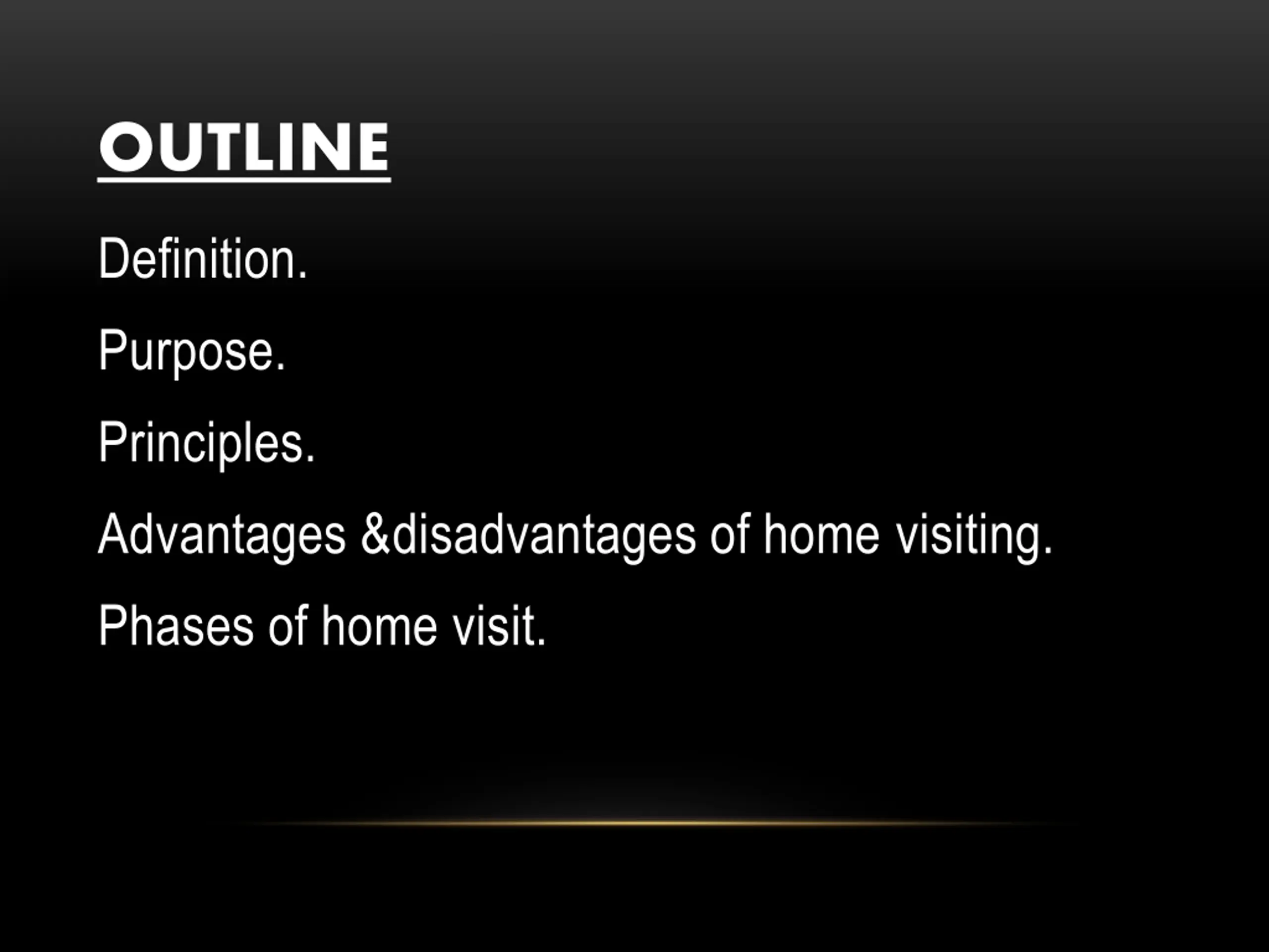 OUTLINE Definition. Purpose. Principles. Advantages &disadvantages of home visiting. Phases of home visit.