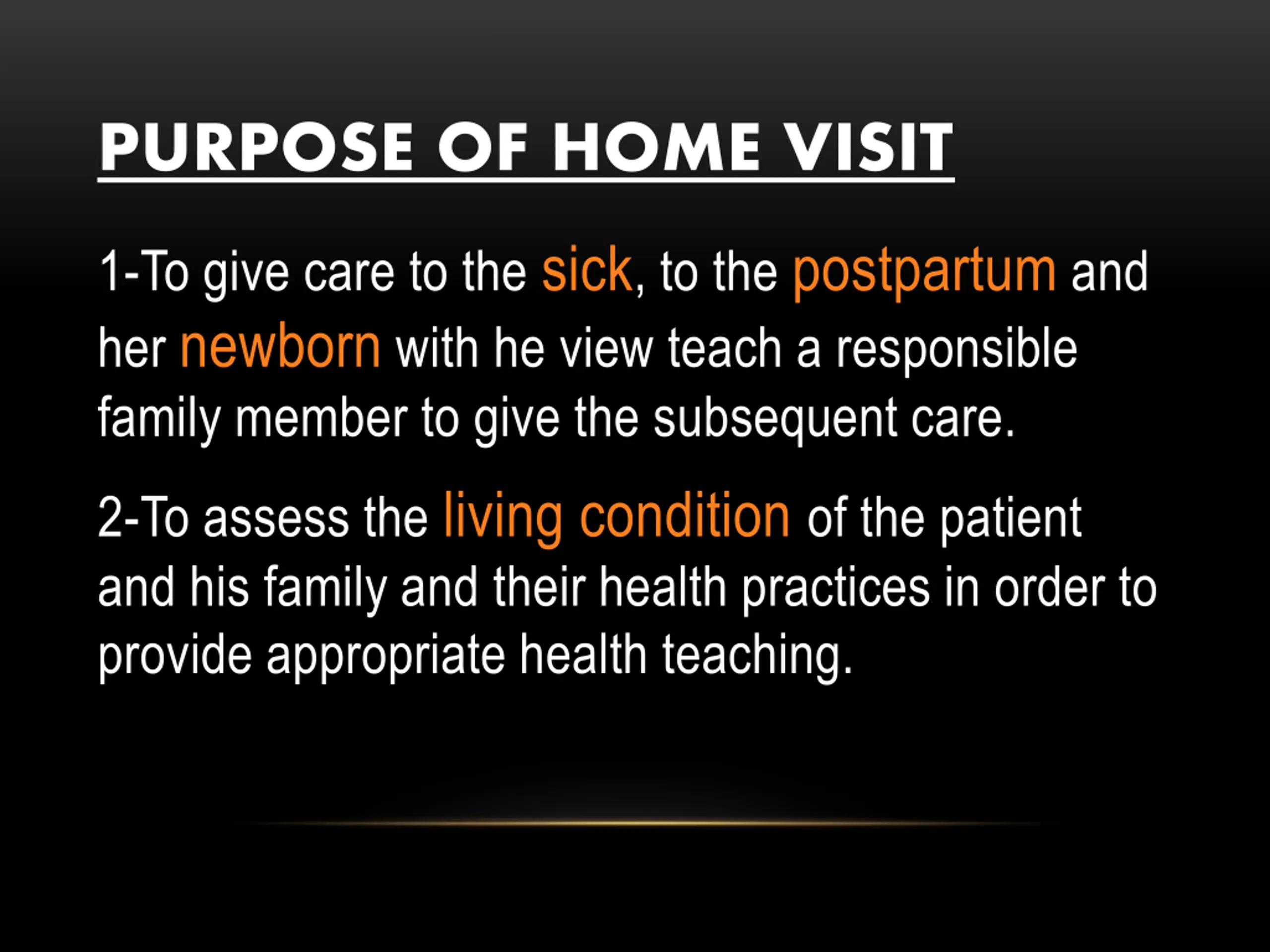 PURPOSE OF HOME VISIT 1-To give care to the sick, to the postpartum and her newborn with he view teach a responsible family member to give the subsequent care. 2-To assess the living condition of the patient and his family and their health practices in order to provide appropriate health teaching.
