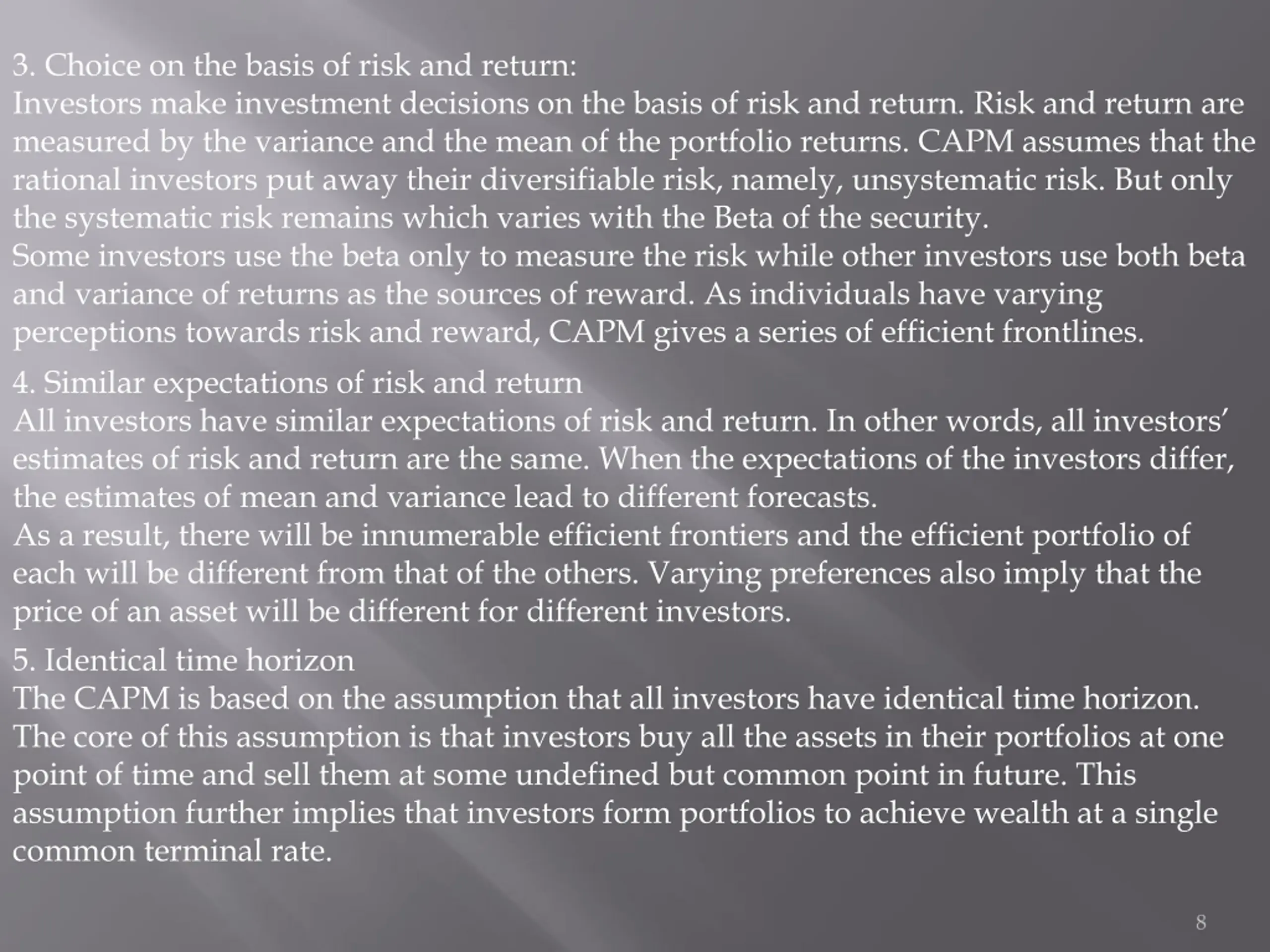 3. Choice on the basis of risk and return: Investors make investment decisions on the basis of risk and return. Risk and return are measured by the variance and the mean of the portfolio returns. CAPM assumes that the rational investors put away their diversifiable risk, namely, unsystematic risk. But only the systematic risk remains which varies with the Beta of the security. Some investors use the beta only to measure the risk while other investors use both beta and variance of returns as the sources of reward. As individuals have varying perceptions towards risk and reward, CAPM gives a series of efficient frontlines. 4. Similar expectations of risk and return All investors have similar expectations of risk and return. In other words, all investors estimates of risk and return are the same. When the expectations of the investors differ, the estimates of mean and variance lead to different forecasts. As a result, there will be innumerable efficient frontiers and the efficient portfolio of each will be different from that of the others. Varying preferences also imply that the price of an asset will be different for different investors. 5. Identical time horizon The CAPM is based on the assumption that all investors have identical time horizon. The core of this assumption is that investors buy all the assets in their portfolios at one point of time and sell them at some undefined but common point in future. This assumption further implies that investors form portfolios to achieve wealth at a single common terminal rate. 8