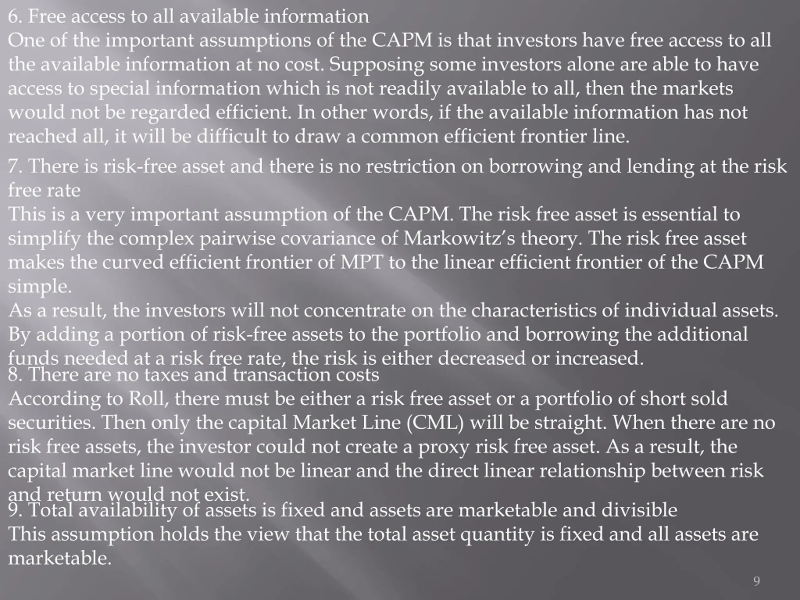 6. Free access to all available information One of the important assumptions of the CAPM is that investors have free access to all the available information at no cost. Supposing some investors alone are able to have access to special information which is not readily available to all, then the markets would not be regarded efficient. In other words, if the available information has not reached all, it will be difficult to draw a common efficient frontier line. 7. There is risk-free asset and there is no restriction on borrowing and lending at the risk free rate This is a very important assumption of the CAPM. The risk free asset is essential to simplify the complex pairwise covariance of Markowitz s theory. The risk free asset makes the curved efficient frontier of MPT to the linear efficient frontier of the CAPM simple. As a result, the investors will not concentrate on the characteristics of individual assets. By adding a portion of risk-free assets to the portfolio and borrowing the additional funds needed at a risk free rate, the risk is either decreased or increased. 8. There are no taxes and transaction costs According to Roll, there must be either a risk free asset or a portfolio of short sold securities. Then only the capital Market Line (CML) will be straight. When there are no risk free assets, the investor could not create a proxy risk free asset. As a result, the capital market line would not be linear and the direct linear relationship between risk and return would not exist. 9. Total availability of assets is fixed and assets are marketable and divisible This assumption holds the view that the total asset quantity is fixed and all assets are marketable. 9