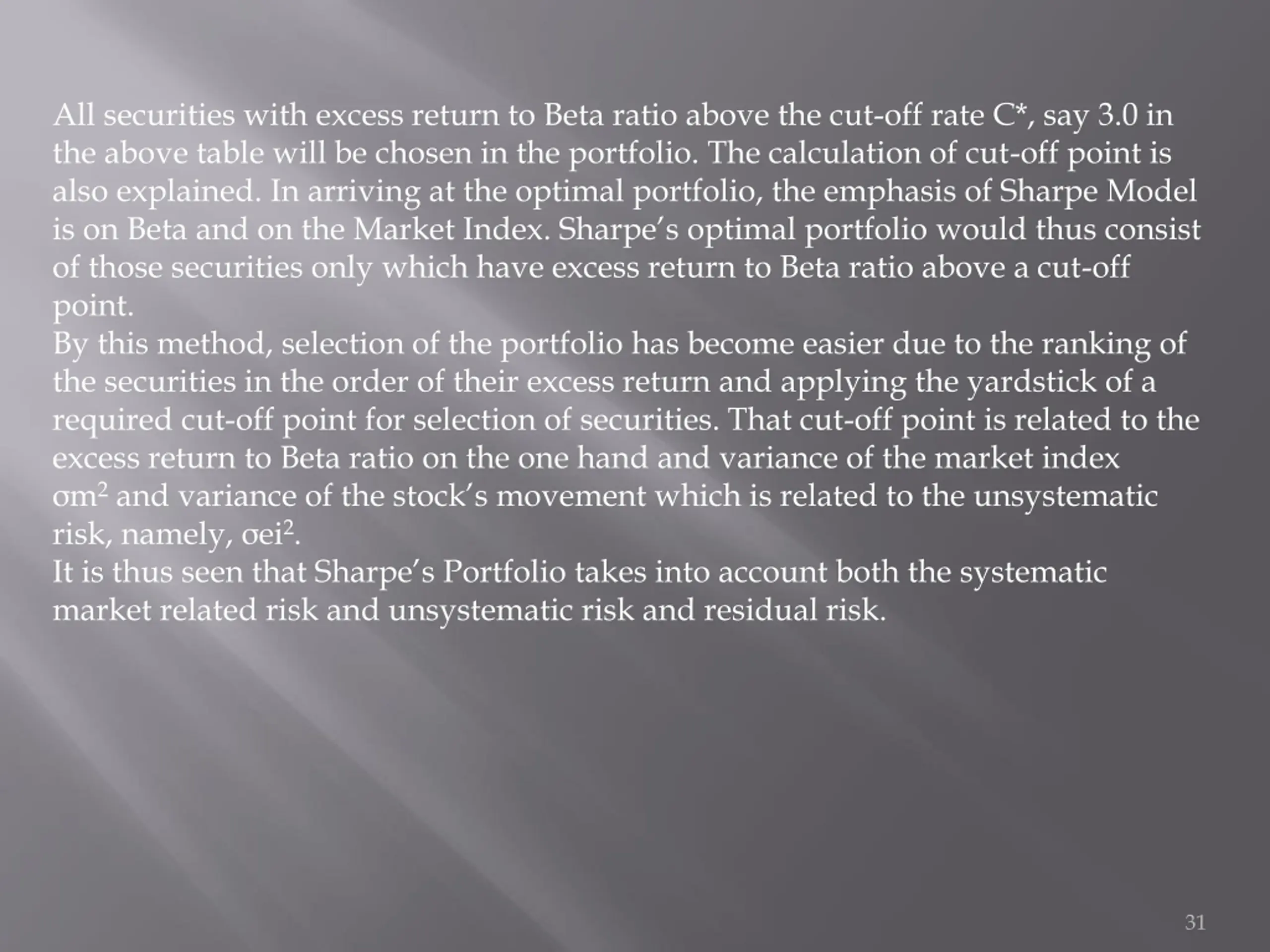 All securities with excess return to Beta ratio above the cut-off rate C*, say 3.0 in the above table will be chosen in the portfolio. The calculation of cut-off point is also explained. In arriving at the optimal portfolio, the emphasis of Sharpe Model is on Beta and on the Market Index. Sharpe s optimal portfolio would thus consist of those securities only which have excess return to Beta ratio above a cut-off point. By this method, selection of the portfolio has become easier due to the ranking of the securities in the order of their excess return and applying the yardstick of a required cut-off point for selection of securities. That cut-off point is related to the excess return to Beta ratio on the one hand and variance of the market index m2and variance of the stock s movement which is related to the unsystematic risk, namely, ei2. It is thus seen that Sharpe s Portfolio takes into account both the systematic market related risk and unsystematic risk and residual risk. 31