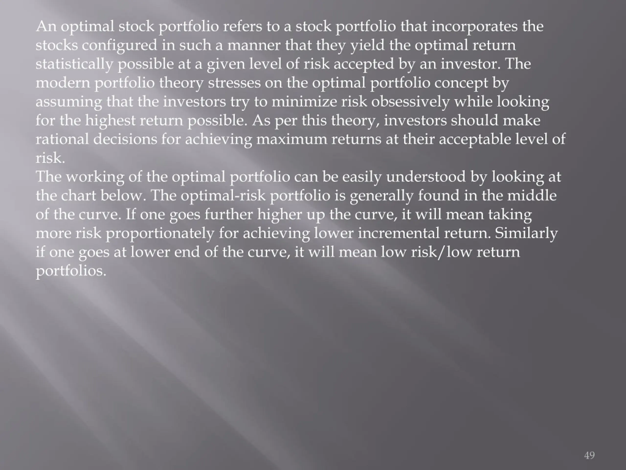 An optimal stock portfolio refers to a stock portfolio that incorporates the stocks configured in such a manner that they yield the optimal return statistically possible at a given level of risk accepted by an investor. The modern portfolio theory stresses on the optimal portfolio concept by assuming that the investors try to minimize risk obsessively while looking for the highest return possible. As per this theory, investors should make rational decisions for achieving maximum returns at their acceptable level of risk. The working of the optimal portfolio can be easily understood by looking at the chart below. The optimal-risk portfolio is generally found in the middle of the curve. If one goes further higher up the curve, it will mean taking more risk proportionately for achieving lower incremental return. Similarly if one goes at lower end of the curve, it will mean low risk/low return portfolios. 49