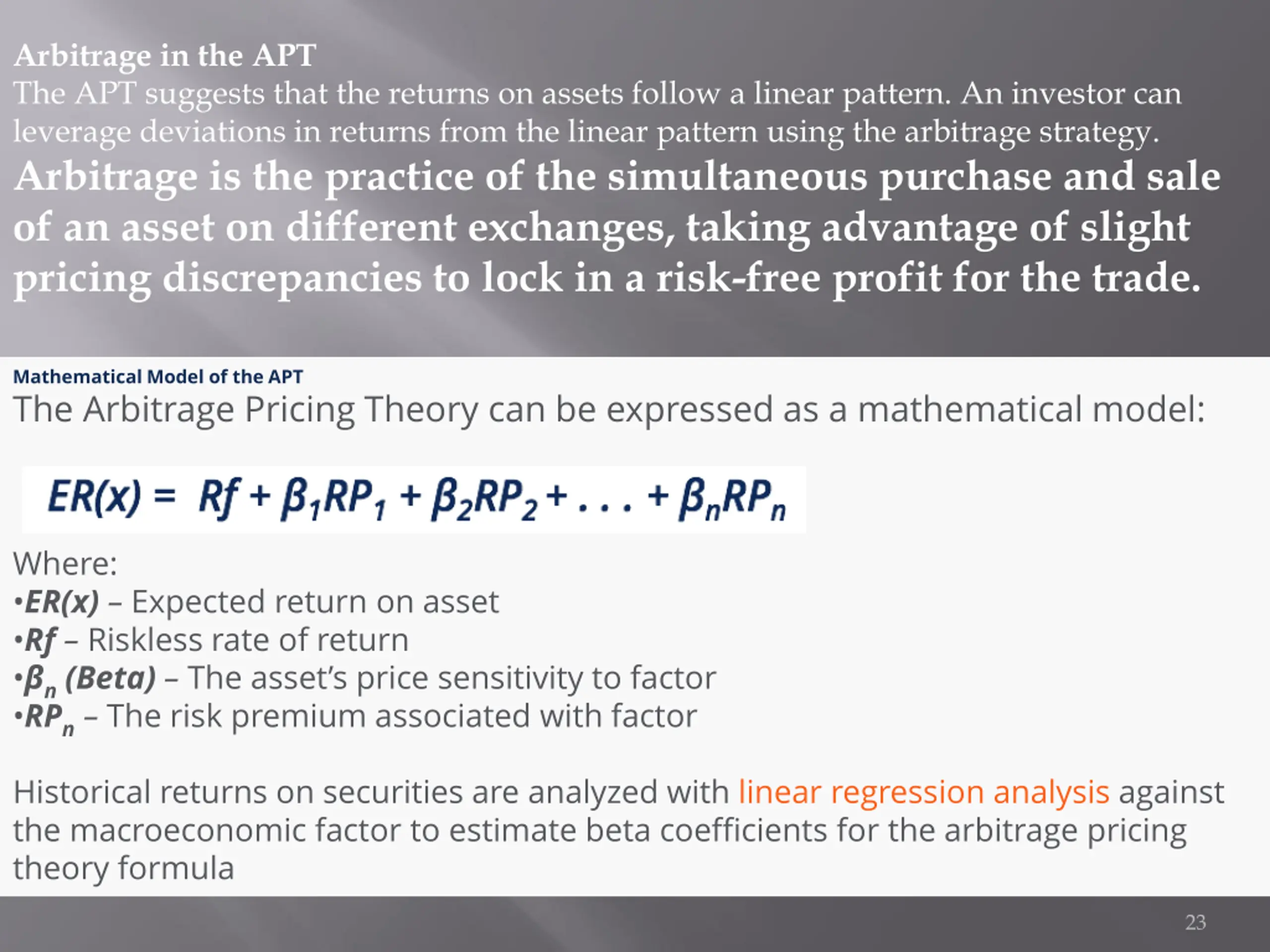 Arbitrage in the APT The APT suggests that the returns on assets follow a linear pattern. An investor can leverage deviations in returns from the linear pattern using the arbitrage strategy. Arbitrage is the practice of the simultaneous purchase and sale of an asset on different exchanges, taking advantage of slight pricing discrepancies to lock in a risk-free profit for the trade. Mathematical Model of the APT The Arbitrage Pricing Theory can be expressed as a mathematical model: Where: ER(x) Expected return on asset Rf Riskless rate of return n(Beta) The asset s price sensitivity to factor RPn The risk premium associated with factor Historical returns on securities are analyzed with linear regression analysis against the macroeconomic factor to estimate beta coefficients for the arbitrage pricing theory formula 23