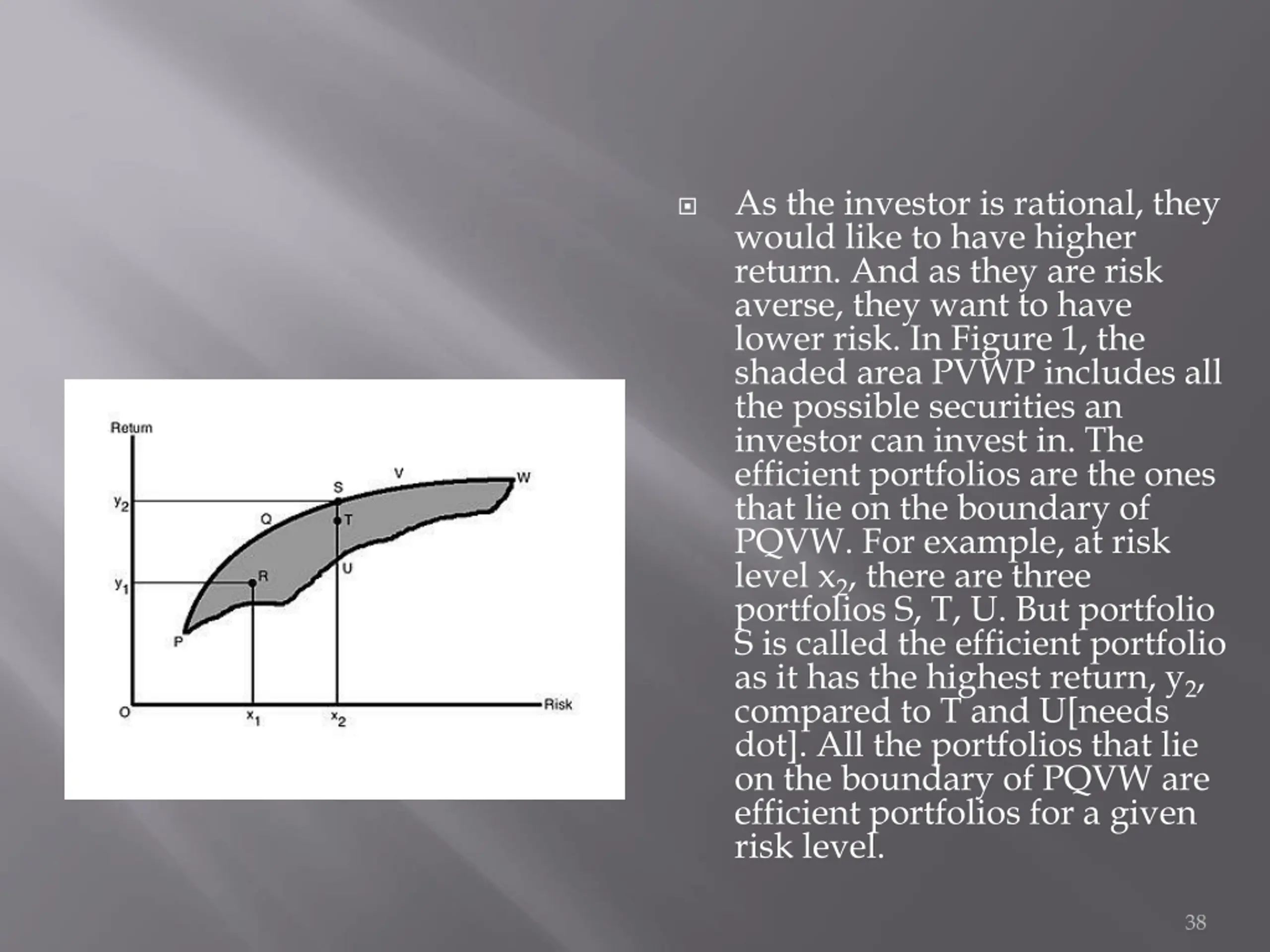 As the investor is rational, they would like to have higher return. And as they are risk averse, they want to have lower risk. In Figure 1, the shaded area PVWP includes all the possible securities an investor can invest in. The efficient portfolios are the ones that lie on the boundary of PQVW. For example, at risk level x2, there are three portfolios S, T, U. But portfolio S is called the efficient portfolio as it has the highest return, y2, compared to T and U[needs dot]. All the portfolios that lie on the boundary of PQVW are efficient portfolios for a given risk level. 38
