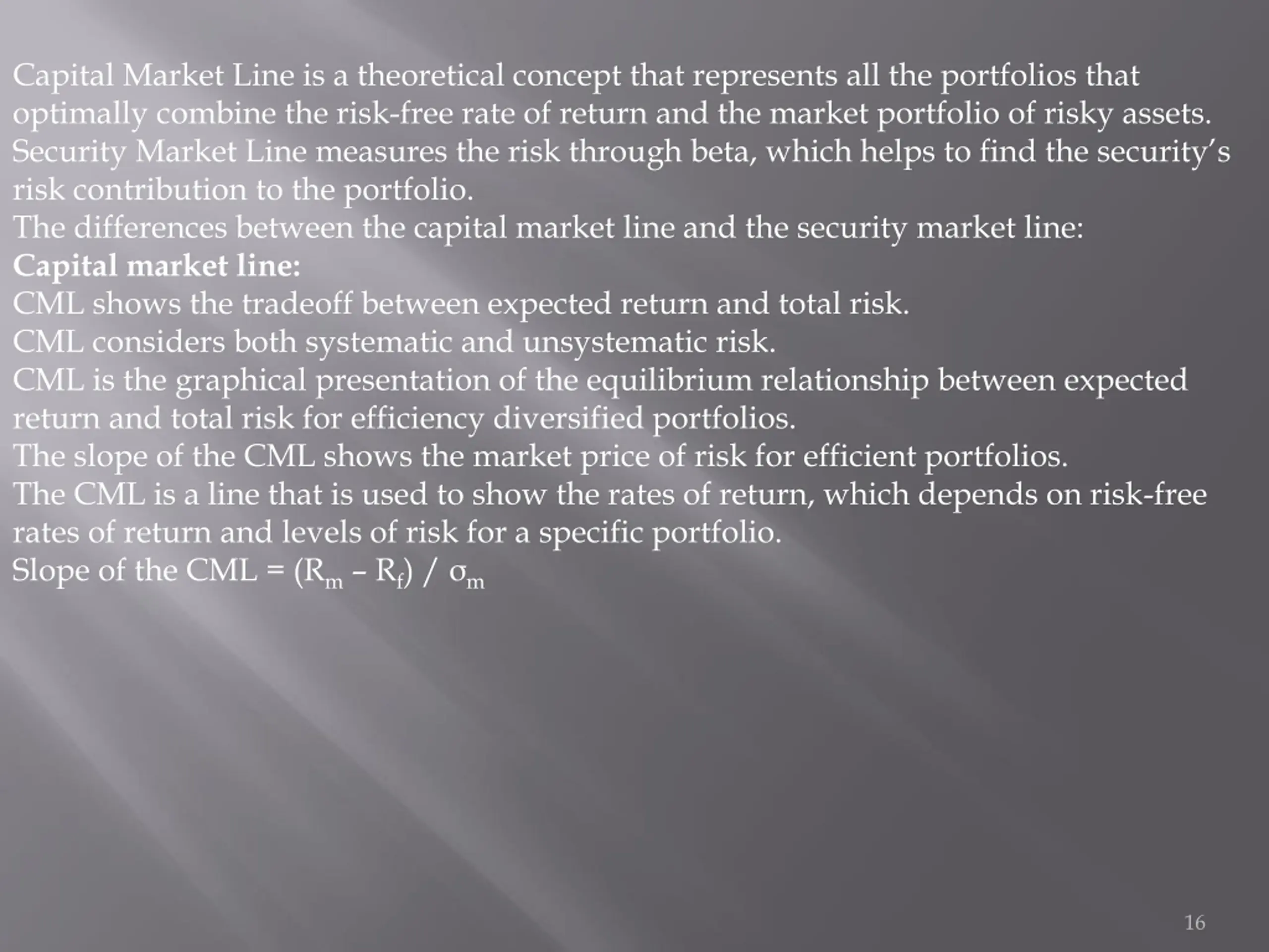 Capital Market Line is a theoretical concept that represents all the portfolios that optimally combine the risk-free rate of return and the market portfolio of risky assets. Security Market Line measures the risk through beta, which helps to find the security s risk contribution to the portfolio. The differences between the capital market line and the security market line: Capital market line: CML shows the tradeoff between expected return and total risk. CML considers both systematic and unsystematic risk. CML is the graphical presentation of the equilibrium relationship between expected return and total risk for efficiency diversified portfolios. The slope of the CML shows the market price of risk for efficient portfolios. The CML is a line that is used to show the rates of return, which depends on risk-free rates of return and levels of risk for a specific portfolio. Slope of the CML = (Rm Rf) / m 16