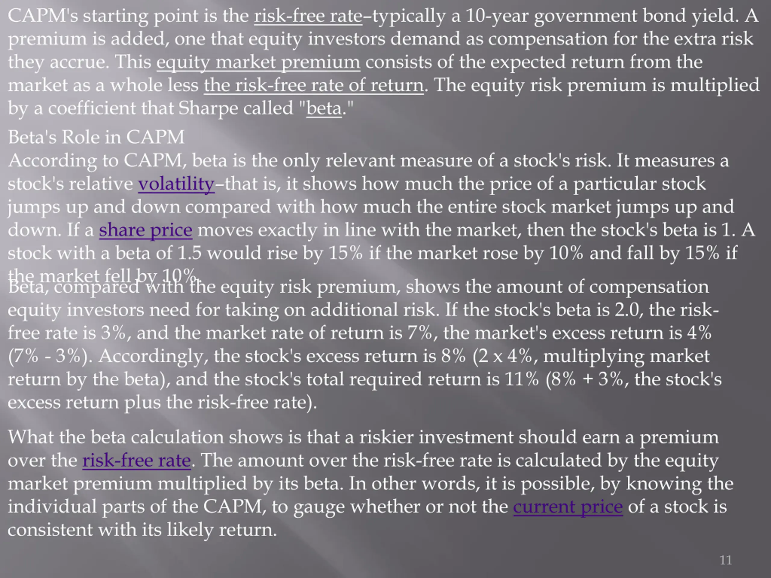 CAPM's starting point is the risk-free ratetypically a 10-year government bond yield. A premium is added, one that equity investors demand as compensation for the extra risk they accrue. This equity market premium consists of the expected return from the market as a whole less the risk-free rate of return. The equity risk premium is multiplied by a coefficient that Sharpe called "beta." Beta's Role in CAPM According to CAPM, beta is the only relevant measure of a stock's risk. It measures a stock's relative volatility that is, it shows how much the price of a particular stock jumps up and down compared with how much the entire stock market jumps up and down. If a share price moves exactly in line with the market, then the stock's beta is 1. A stock with a beta of 1.5 would rise by 15% if the market rose by 10% and fall by 15% if the market fell by 10%. Beta, compared with the equity risk premium, shows the amount of compensation equity investors need for taking on additional risk. If the stock's beta is 2.0, the risk- free rate is 3%, and the market rate of return is 7%, the market's excess return is 4% (7% - 3%). Accordingly, the stock's excess return is 8% (2 x 4%, multiplying market return by the beta), and the stock's total required return is 11% (8% + 3%, the stock's excess return plus the risk-free rate). What the beta calculation shows is that a riskier investment should earn a premium over the risk-free rate. The amount over the risk-free rate is calculated by the equity market premium multiplied by its beta. In other words, it is possible, by knowing the individual parts of the CAPM, to gauge whether or not the current price of a stock is consistent with its likely return. 11