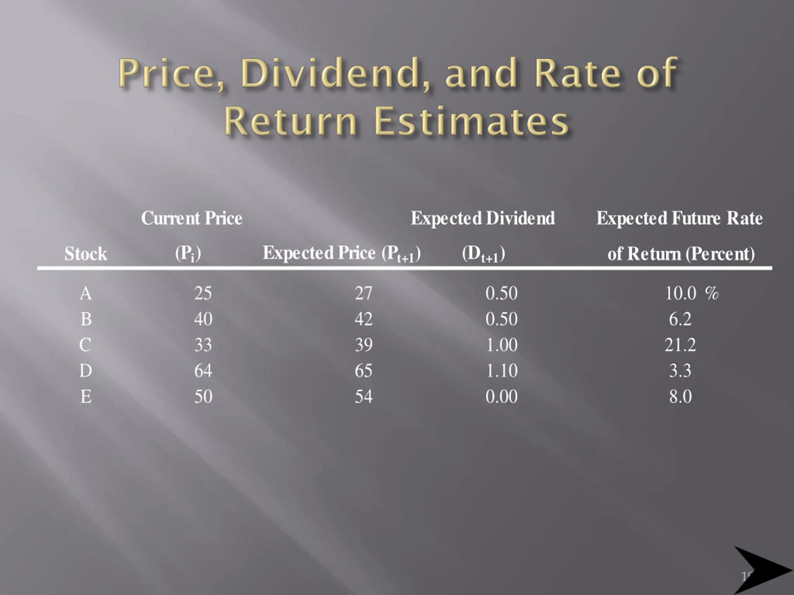 Current Price Expected Dividend Expected Future Rate (Pi) Expected Price (Pt+1) (Dt+1) Stock of Return (Percent) A B C D E 25 40 33 64 50 27 42 39 65 54 0.50 0.50 1.00 1.10 0.00 10.0 % 6.2 21.2 3.3 8.0 19