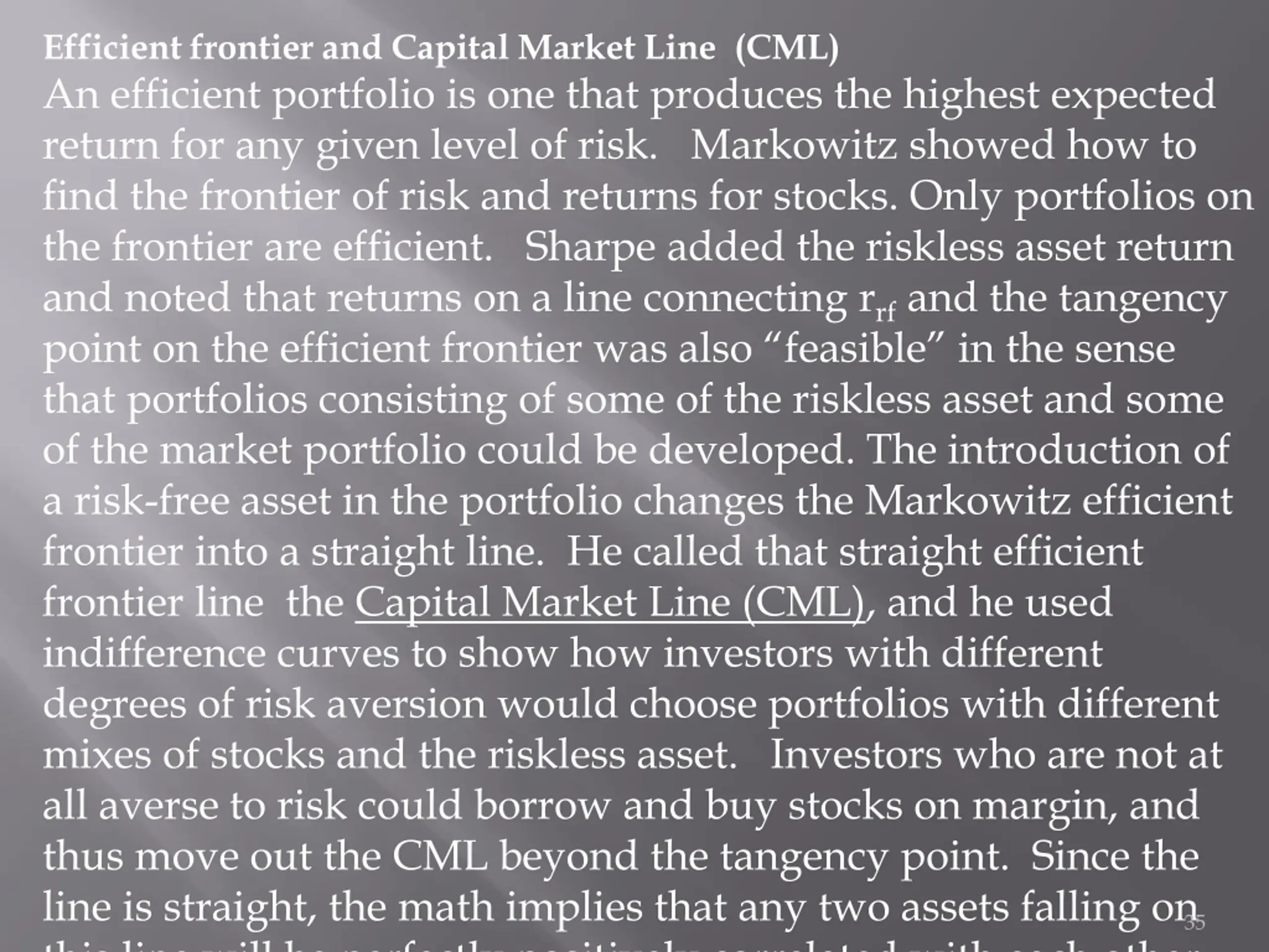 Efficient frontier and Capital Market Line (CML) An efficient portfolio is one that produces the highest expected return for any given level of risk. Markowitz showed how to find the frontier of risk and returns for stocks. Only portfolios on the frontier are efficient. Sharpe added the riskless asset return and noted that returns on a line connecting rrfand the tangency point on the efficient frontier was also feasible in the sense that portfolios consisting of some of the riskless asset and some of the market portfolio could be developed. The introduction of a risk-free asset in the portfolio changes the Markowitz efficient frontier into a straight line. He called that straight efficient frontier line the Capital Market Line (CML), and he used indifference curves to show how investors with different degrees of risk aversion would choose portfolios with different mixes of stocks and the riskless asset. Investors who are not at all averse to risk could borrow and buy stocks on margin, and thus move out the CML beyond the tangency point. Since the line is straight, the math implies that any two assets falling on this line will be perfectly positively correlated with each other. 35