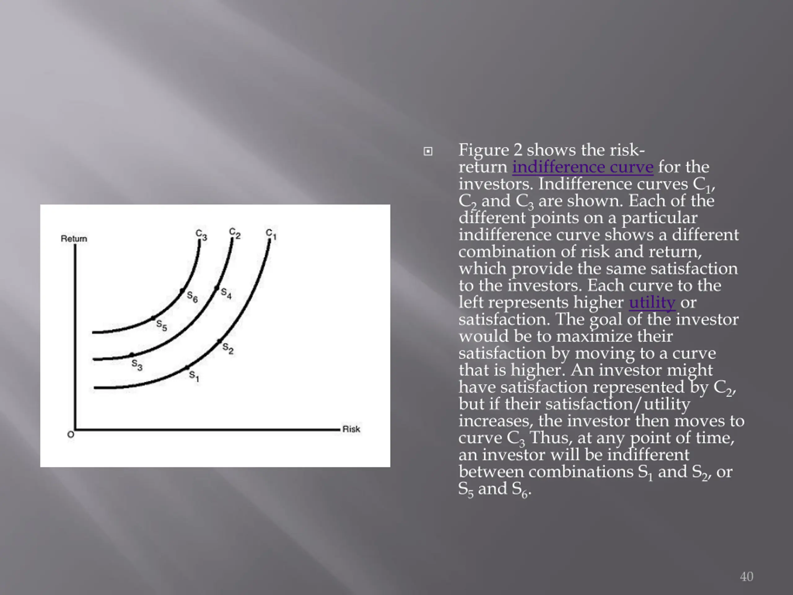Figure 2 shows the risk- return indifference curve for the investors. Indifference curves C1, C2and C3are shown. Each of the different points on a particular indifference curve shows a different combination of risk and return, which provide the same satisfaction to the investors. Each curve to the left represents higher utility or satisfaction. The goal of the investor would be to maximize their satisfaction by moving to a curve that is higher. An investor might have satisfaction represented by C2, but if their satisfaction/utility increases, the investor then moves to curve C3Thus, at any point of time, an investor will be indifferent between combinations S1and S2, or S5and S6. 40