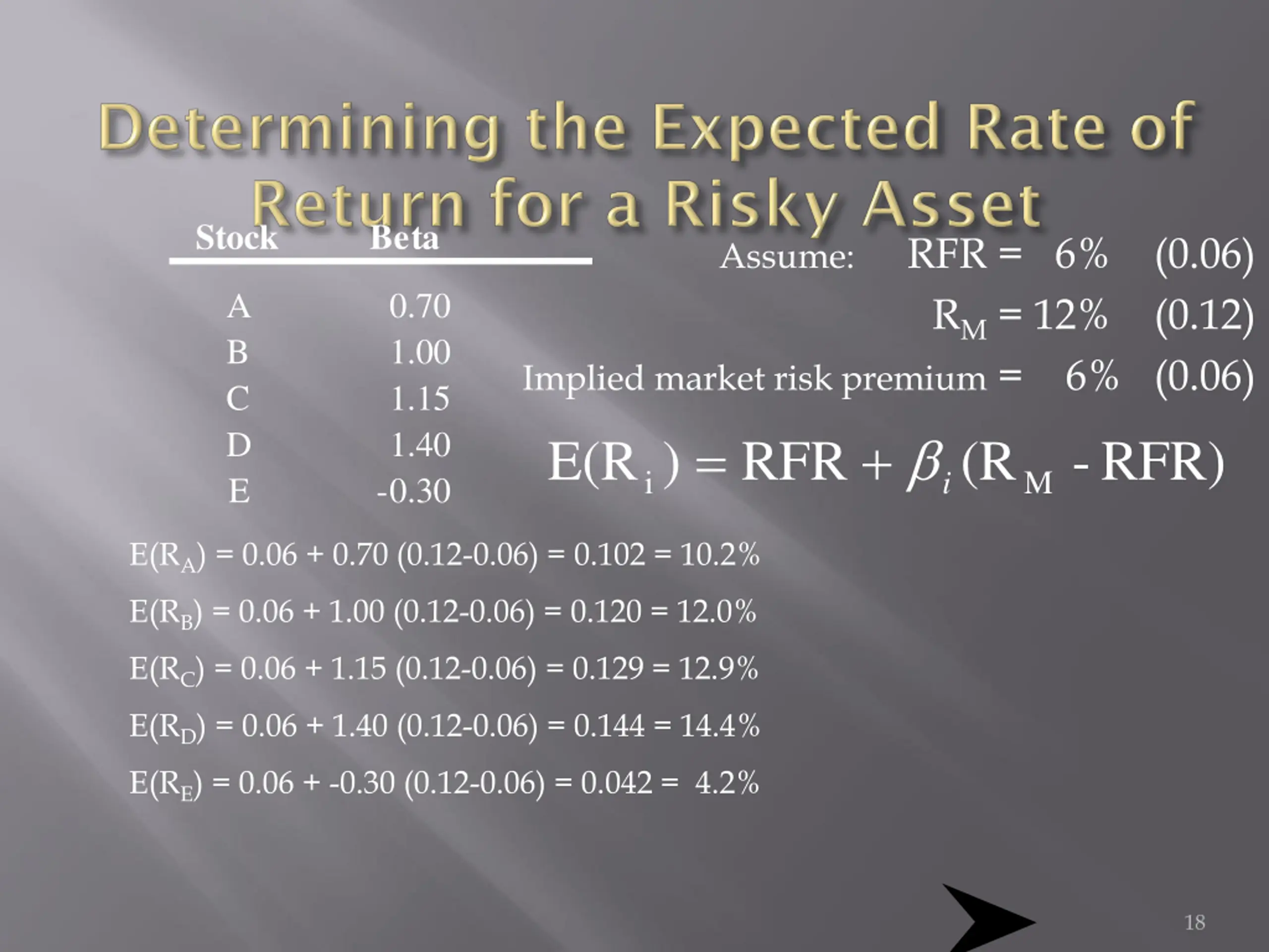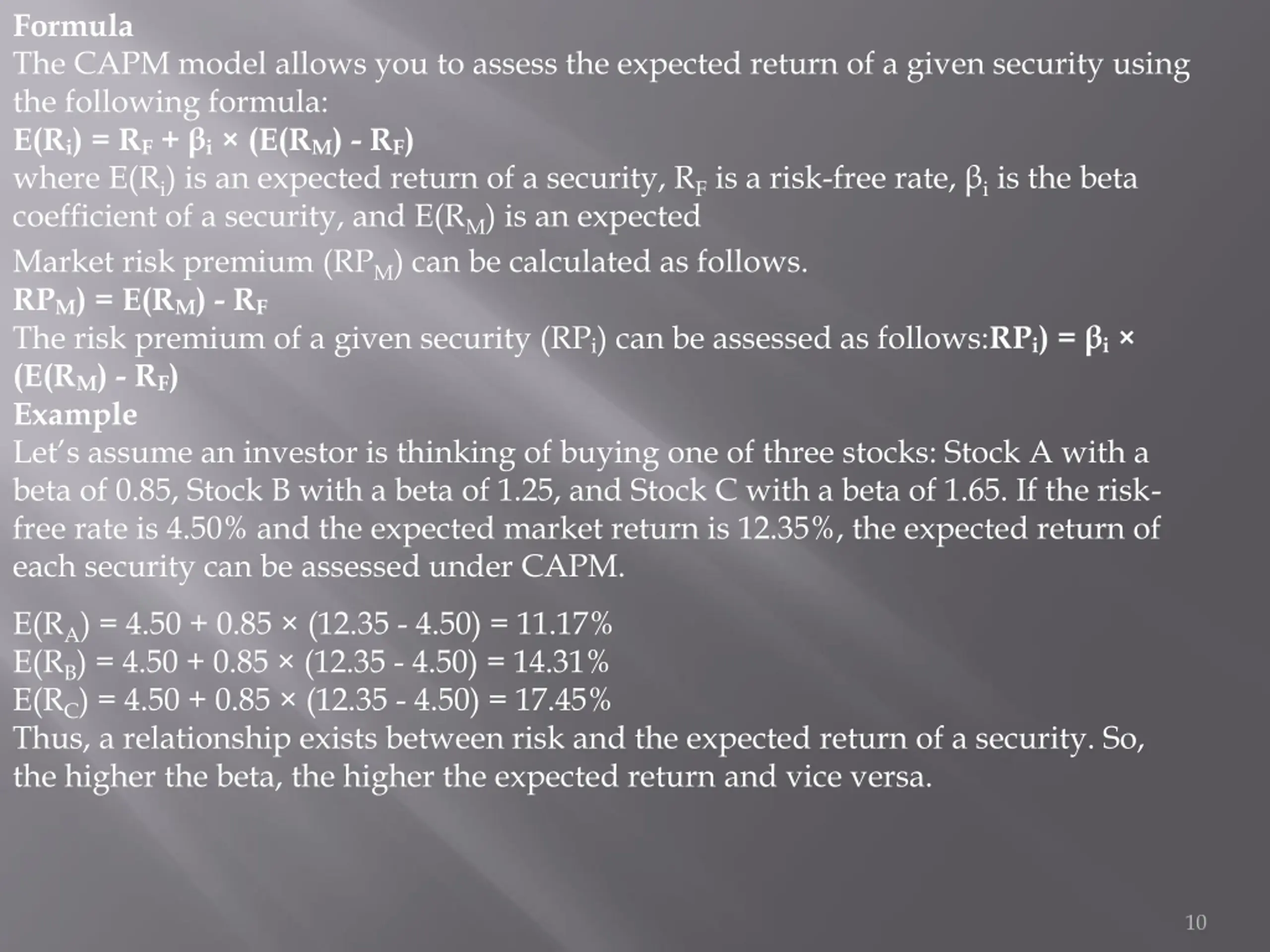 Formula The CAPM model allows you to assess the expected return of a given security using the following formula: E(Ri) = RF+ i (E(RM) - RF) where E(Ri) is an expected return of a security, RFis a risk-free rate, iis the beta coefficient of a security, and E(RM) is an expected Market risk premium (RPM) can be calculated as follows. RPM) = E(RM) - RF The risk premium of a given security (RPi) can be assessed as follows:RPi) = i (E(RM) - RF) Example Let s assume an investor is thinking of buying one of three stocks: Stock A with a beta of 0.85, Stock B with a beta of 1.25, and Stock C with a beta of 1.65. If the risk- free rate is 4.50% and the expected market return is 12.35%, the expected return of each security can be assessed under CAPM. E(RA) = 4.50 + 0.85 (12.35 - 4.50) = 11.17% E(RB) = 4.50 + 0.85 (12.35 - 4.50) = 14.31% E(RC) = 4.50 + 0.85 (12.35 - 4.50) = 17.45% Thus, a relationship exists between risk and the expected return of a security. So, the higher the beta, the higher the expected return and vice versa. 10
