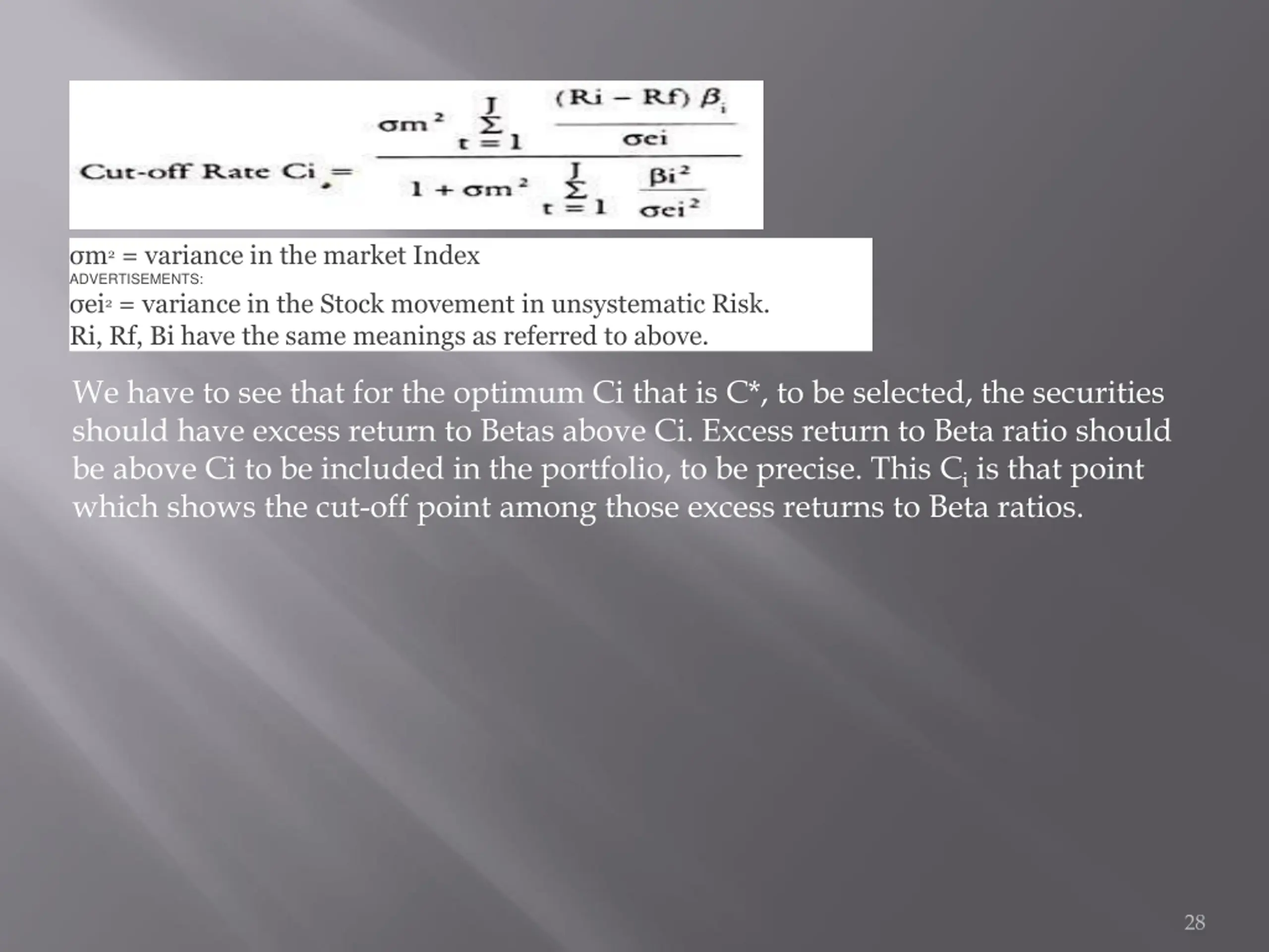 https://www.economicsdiscussion.net/wp-content/uploads/2017/12/clip_image041_thumb2_thumb.jpghttps://www.economicsdiscussion.net/wp-content/uploads/2017/12/clip_image041_thumb2_thumb.jpg m2= variance in the market Index ADVERTISEMENTS: ei2= variance in the Stock movement in unsystematic Risk. Ri, Rf, Bi have the same meanings as referred to above. We have to see that for the optimum Ci that is C*, to be selected, the securities should have excess return to Betas above Ci. Excess return to Beta ratio should be above Ci to be included in the portfolio, to be precise. This Ciis that point which shows the cut-off point among those excess returns to Beta ratios. 28