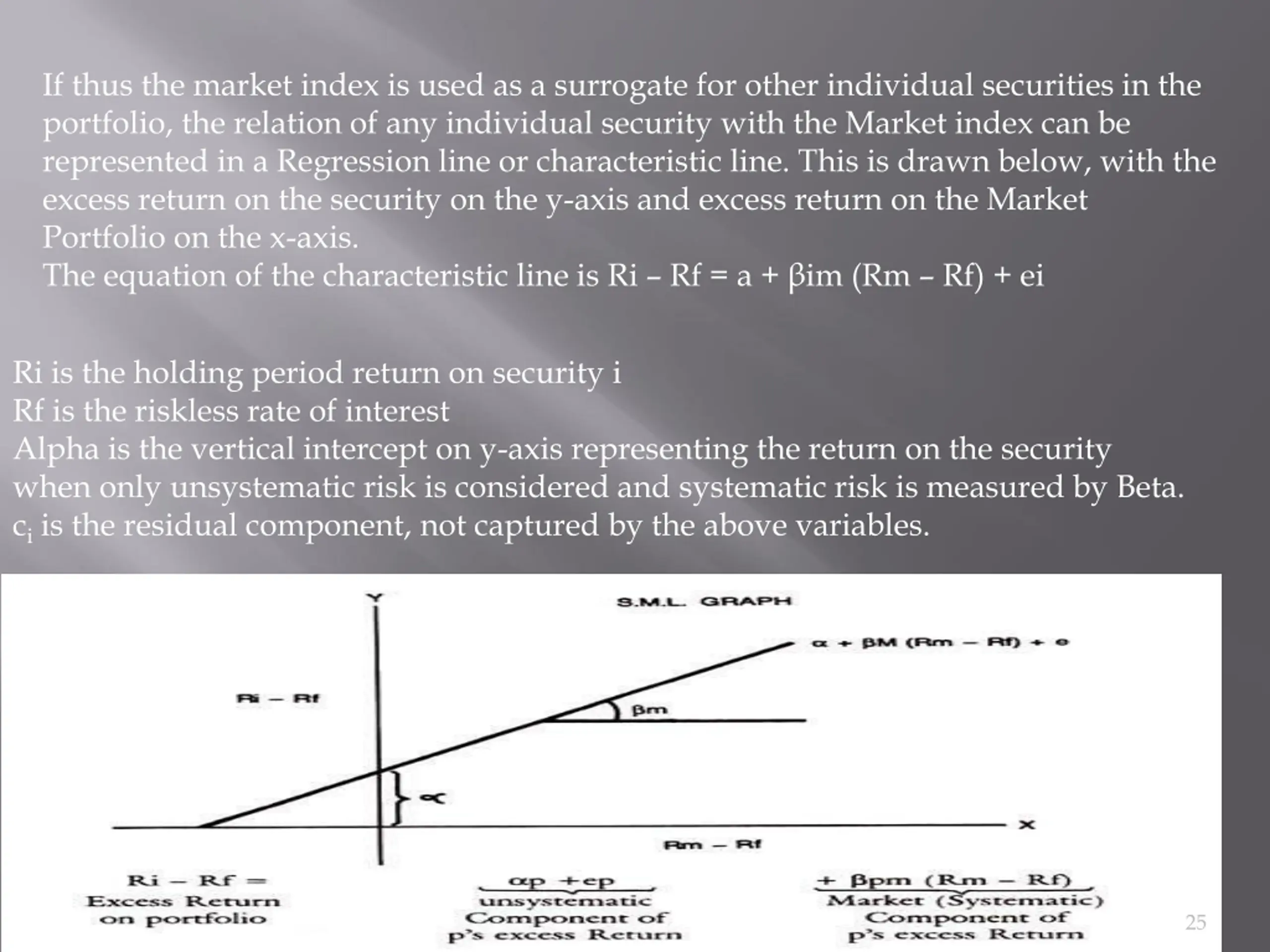 If thus the market index is used as a surrogate for other individual securities in the portfolio, the relation of any individual security with the Market index can be represented in a Regression line or characteristic line. This is drawn below, with the excess return on the security on the y-axis and excess return on the Market Portfolio on the x-axis. The equation of the characteristic line is Ri Rf = a + im (Rm Rf) + ei Ri is the holding period return on security i Rf is the riskless rate of interest Alpha is the vertical intercept on y-axis representing the return on the security when only unsystematic risk is considered and systematic risk is measured by Beta. ciis the residual component, not captured by the above variables. 25