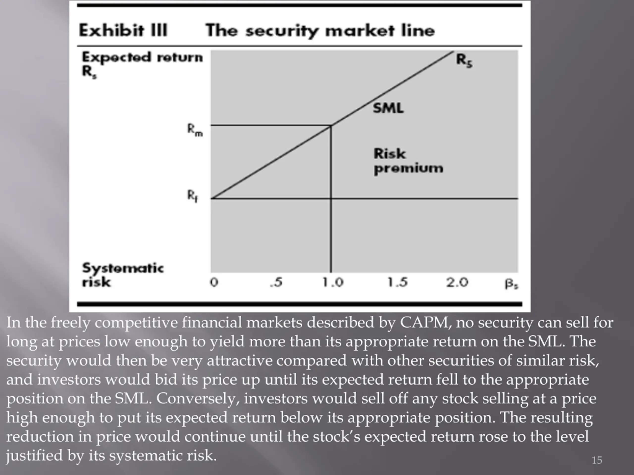 In the freely competitive financial markets described by CAPM, no security can sell for long at prices low enough to yield more than its appropriate return on the SML. The security would then be very attractive compared with other securities of similar risk, and investors would bid its price up until its expected return fell to the appropriate position on the SML. Conversely, investors would sell off any stock selling at a price high enough to put its expected return below its appropriate position. The resulting reduction in price would continue until the stock s expected return rose to the level justified by its systematic risk. 15