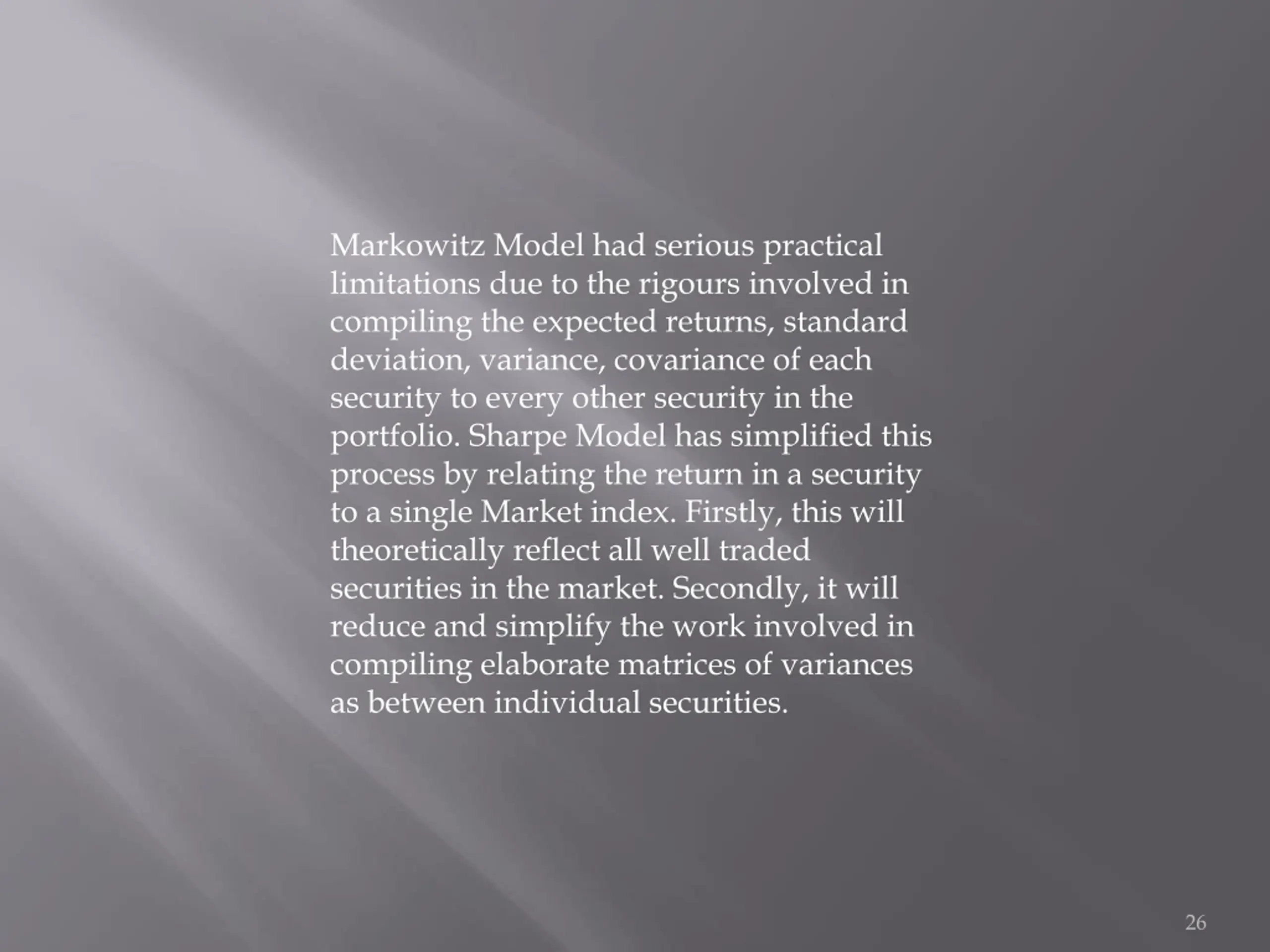 Markowitz Model had serious practical limitations due to the rigours involved in compiling the expected returns, standard deviation, variance, covariance of each security to every other security in the portfolio. Sharpe Model has simplified this process by relating the return in a security to a single Market index. Firstly, this will theoretically reflect all well traded securities in the market. Secondly, it will reduce and simplify the work involved in compiling elaborate matrices of variances as between individual securities. 26