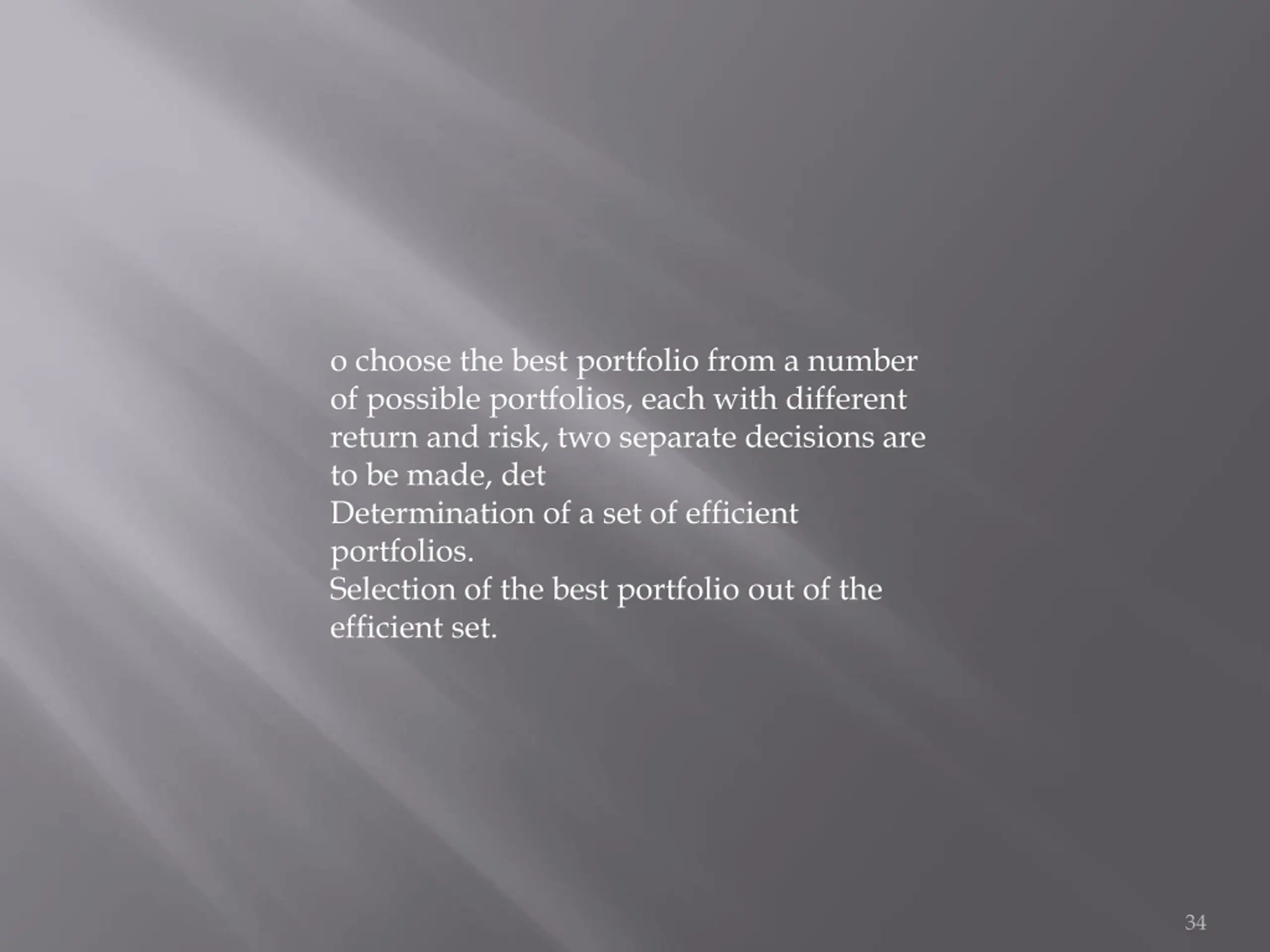 o choose the best portfolio from a number of possible portfolios, each with different return and risk, two separate decisions are to be made, det Determination of a set of efficient portfolios. Selection of the best portfolio out of the efficient set. 34