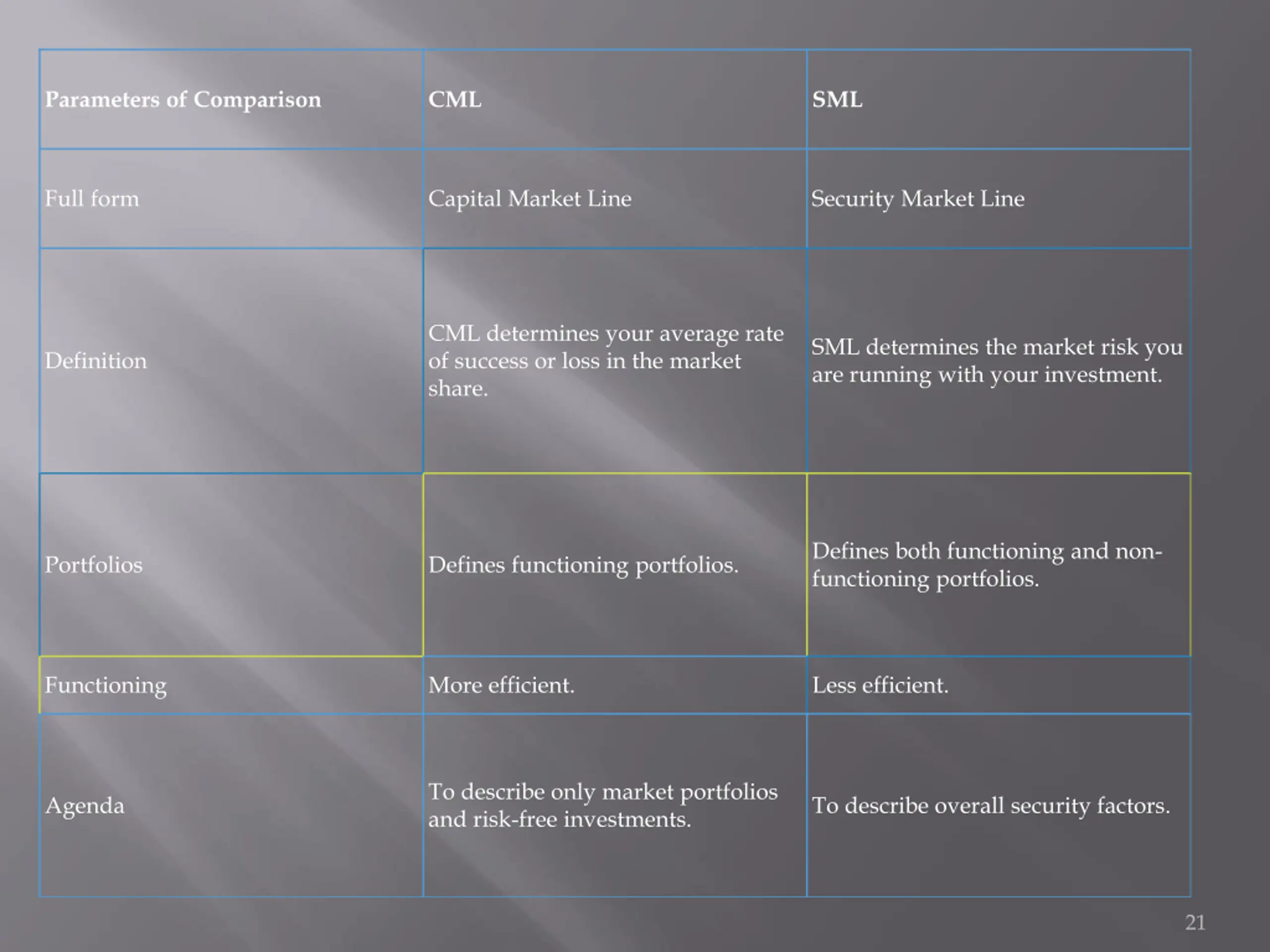 Parameters of Comparison CML SML Full form Capital Market Line Security Market Line CML determines your average rate of success or loss in the market share. SML determines the market risk you are running with your investment. Definition Defines both functioning and non- functioning portfolios. Portfolios Defines functioning portfolios. Functioning More efficient. Less efficient. To describe only market portfolios and risk-free investments. Agenda To describe overall security factors. 21