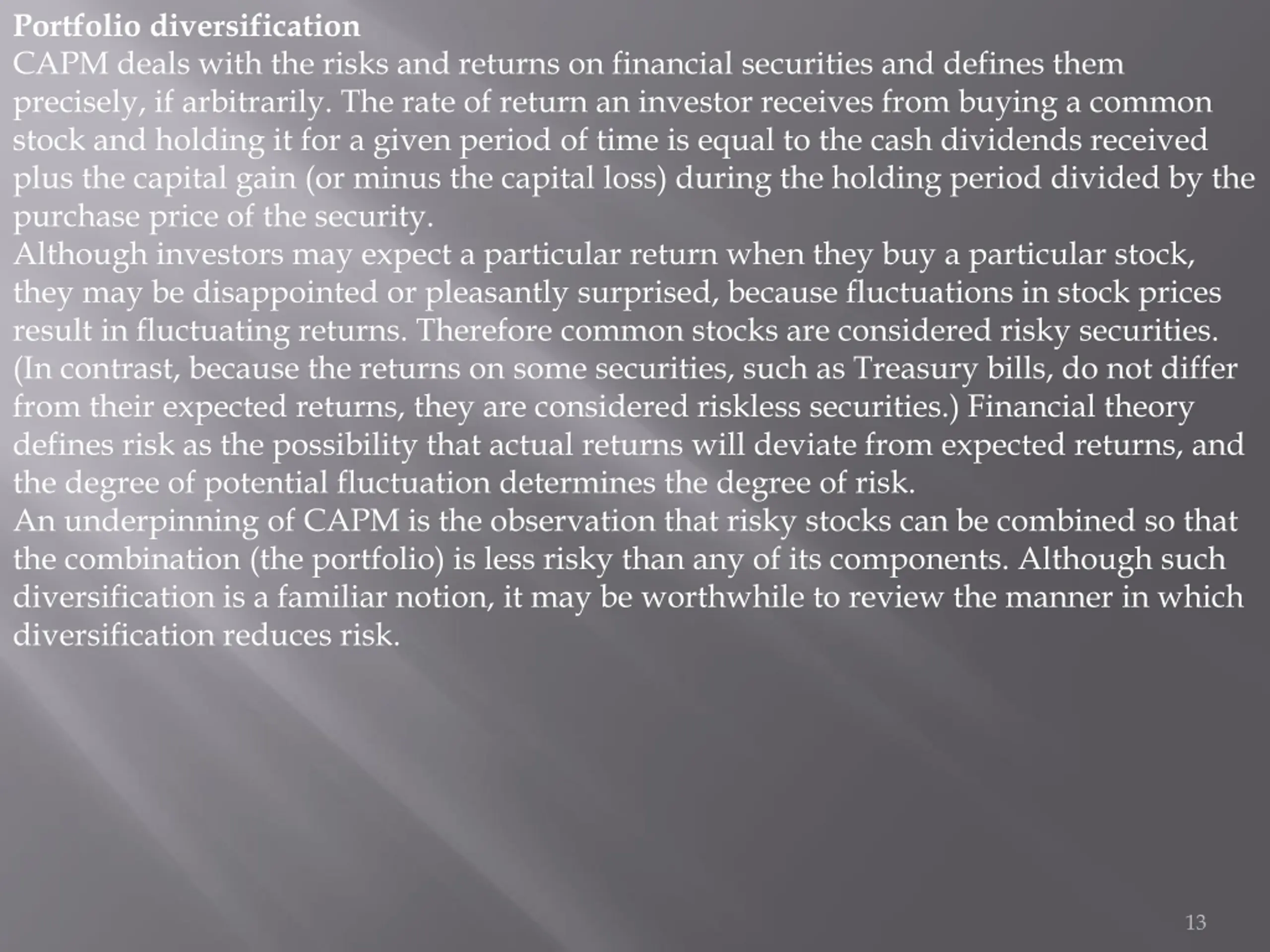 Portfolio diversification CAPM deals with the risks and returns on financial securities and defines them precisely, if arbitrarily. The rate of return an investor receives from buying a common stock and holding it for a given period of time is equal to the cash dividends received plus the capital gain (or minus the capital loss) during the holding period divided by the purchase price of the security. Although investors may expect a particular return when they buy a particular stock, they may be disappointed or pleasantly surprised, because fluctuations in stock prices result in fluctuating returns. Therefore common stocks are considered risky securities. (In contrast, because the returns on some securities, such as Treasury bills, do not differ from their expected returns, they are considered riskless securities.) Financial theory defines risk as the possibility that actual returns will deviate from expected returns, and the degree of potential fluctuation determines the degree of risk. An underpinning of CAPM is the observation that risky stocks can be combined so that the combination (the portfolio) is less risky than any of its components. Although such diversification is a familiar notion, it may be worthwhile to review the manner in which diversification reduces risk. 13