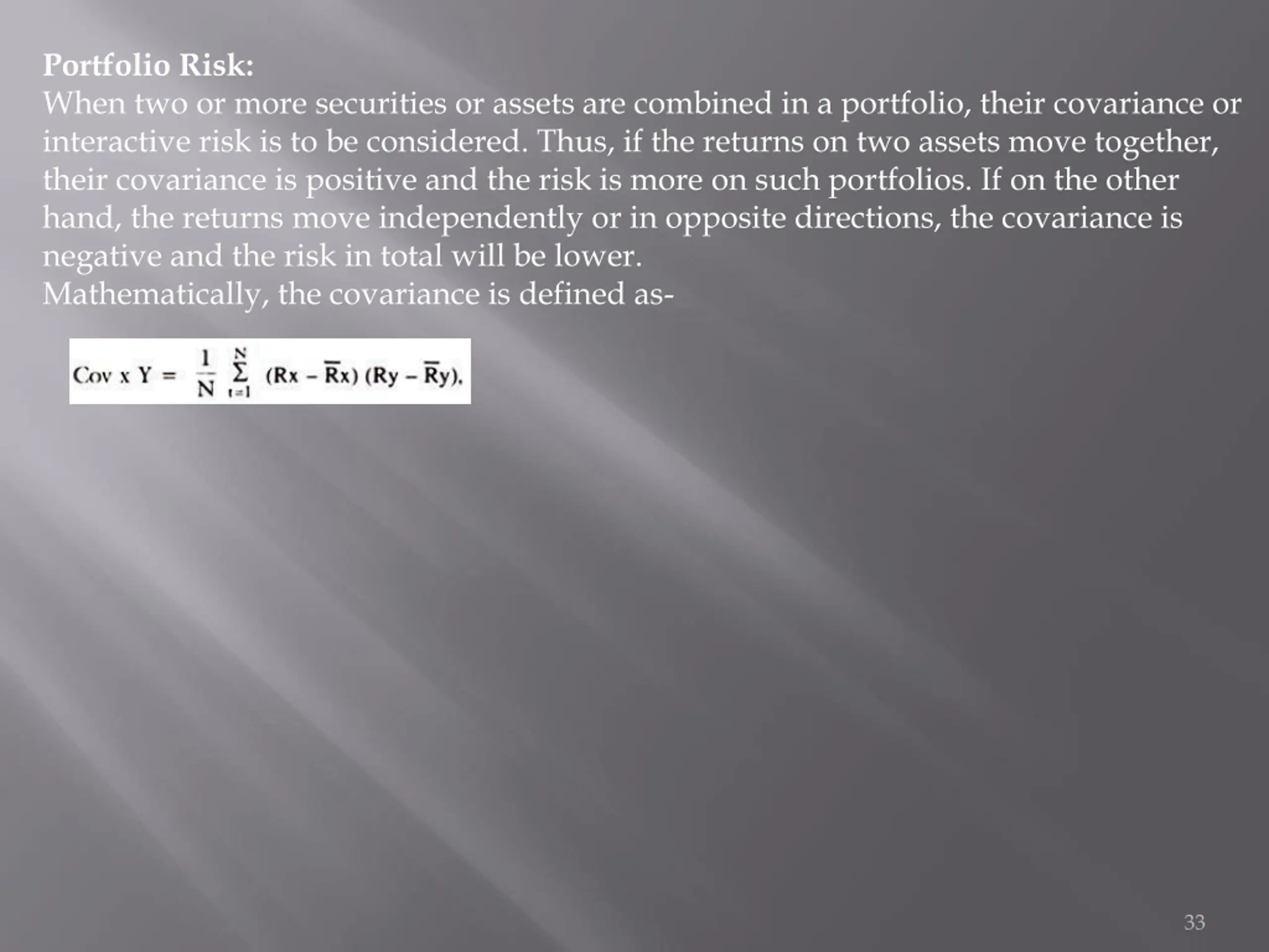 Portfolio Risk: When two or more securities or assets are combined in a portfolio, their covariance or interactive risk is to be considered. Thus, if the returns on two assets move together, their covariance is positive and the risk is more on such portfolios. If on the other hand, the returns move independently or in opposite directions, the covariance is negative and the risk in total will be lower. Mathematically, the covariance is defined as- 33