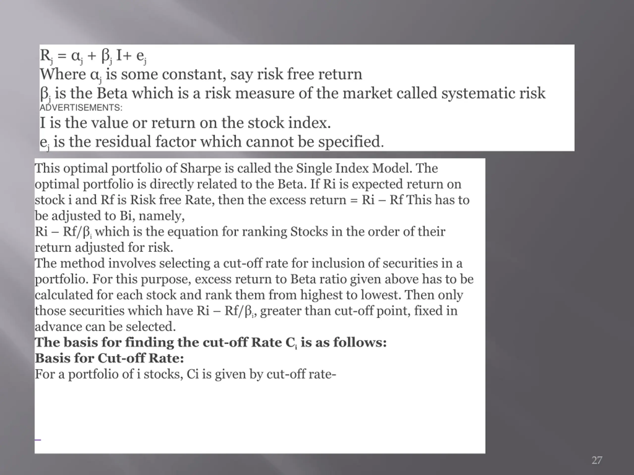 Rj= j+ jI+ ej Where jis some constant, say risk free return jis the Beta which is a risk measure of the market called systematic risk ADVERTISEMENTS: I is the value or return on the stock index. ejis the residual factor which cannot be specified. This optimal portfolio of Sharpe is called the Single Index Model. The optimal portfolio is directly related to the Beta. If Ri is expected return on stock i and Rf is Risk free Rate, then the excess return = Ri Rf This has to be adjusted to Bi, namely, Ri Rf/ iwhich is the equation for ranking Stocks in the order of their return adjusted for risk. The method involves selecting a cut-off rate for inclusion of securities in a portfolio. For this purpose, excess return to Beta ratio given above has to be calculated for each stock and rank them from highest to lowest. Then only those securities which have Ri Rf/ i, greater than cut-off point, fixed in advance can be selected. The basis for finding the cut-off Rate Ciis as follows: Basis for Cut-off Rate: For a portfolio of i stocks, Ci is given by cut-off rate- 27