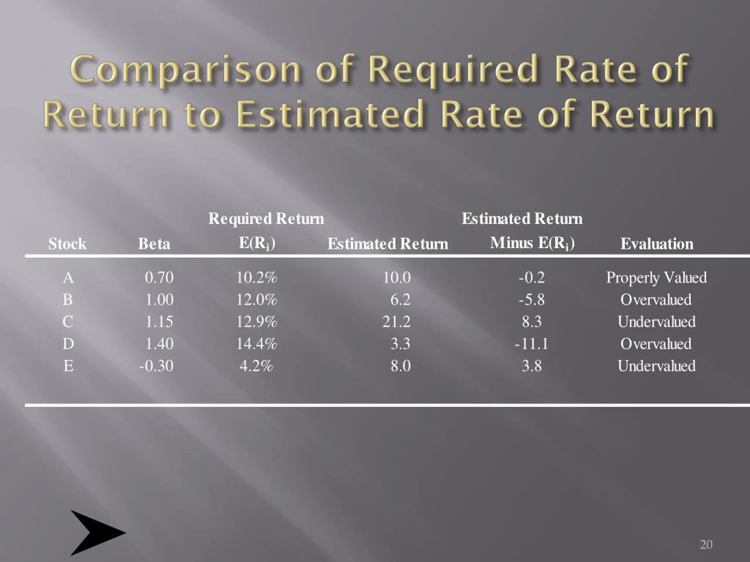 Required Return Estimated Return E(Ri) Minus E(Ri) Stock Beta Estimated Return Evaluation A B C D E 0.70 1.00 1.15 1.40 -0.30 10.2% 12.0% 12.9% 14.4% 4.2% 10.0 6.2 21.2 3.3 8.0 -0.2 -5.8 8.3 -11.1 3.8 Properly Valued Overvalued Undervalued Overvalued Undervalued 20