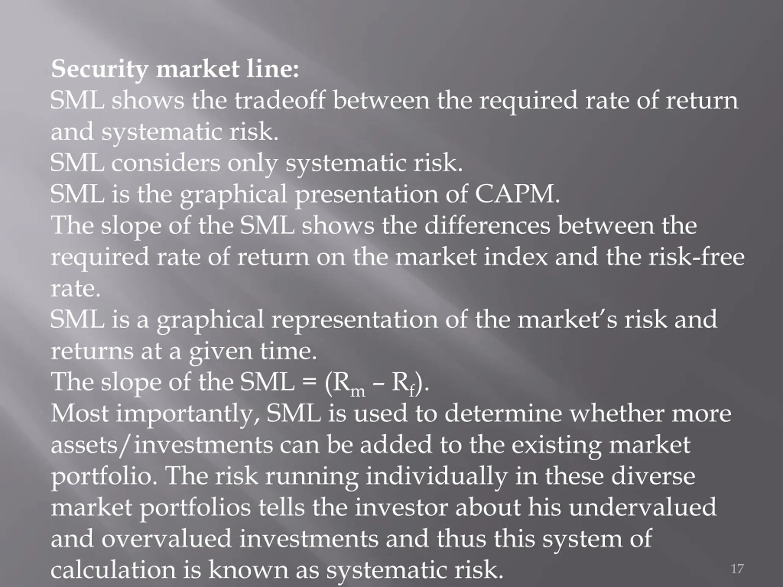 Security market line: SML shows the tradeoff between the required rate of return and systematic risk. SML considers only systematic risk. SML is the graphical presentation of CAPM. The slope of the SML shows the differences between the required rate of return on the market index and the risk-free rate. SML is a graphical representation of the market s risk and returns at a given time. The slope of the SML = (Rm Rf). Most importantly, SML is used to determine whether more assets/investments can be added to the existing market portfolio. The risk running individually in these diverse market portfolios tells the investor about his undervalued and overvalued investments and thus this system of calculation is known as systematic risk. 17
