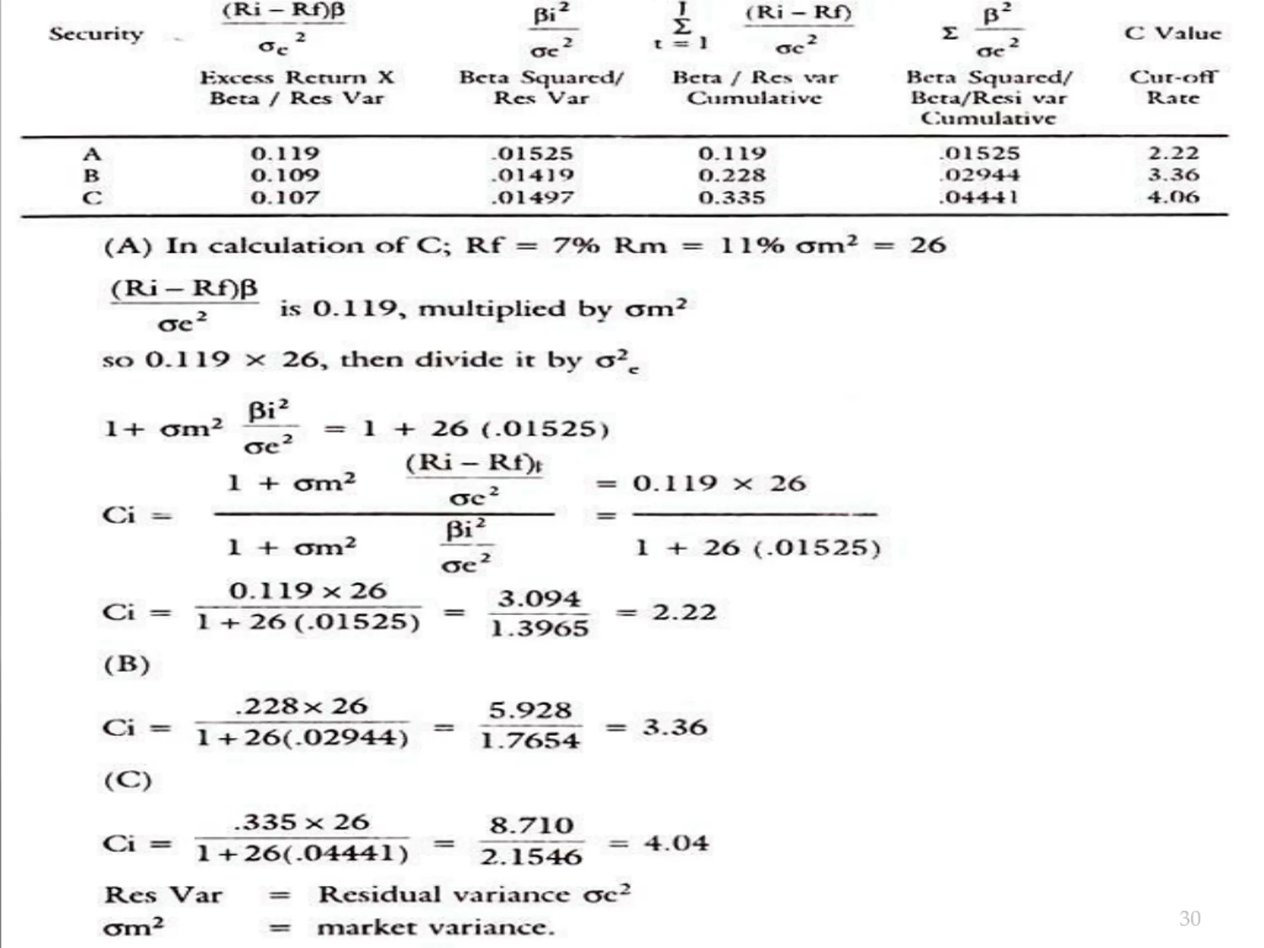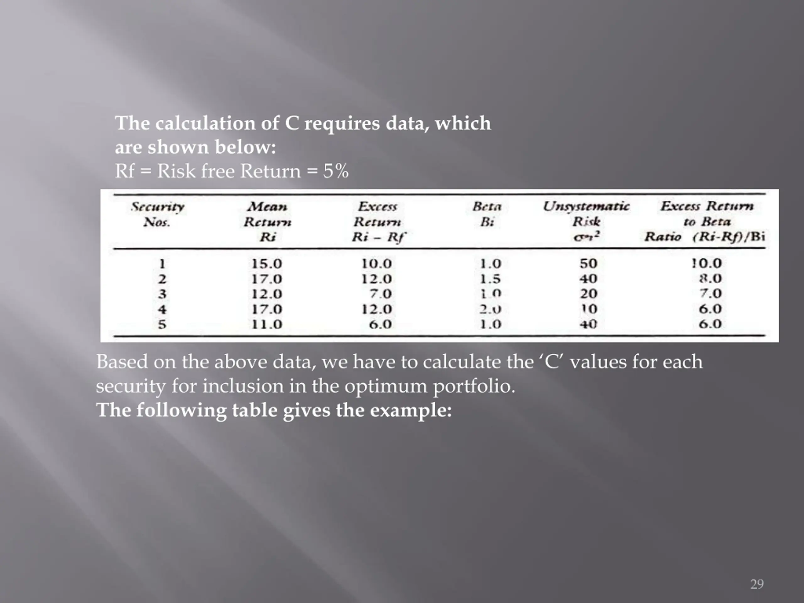 The calculation of C requires data, which are shown below: Rf = Risk free Return = 5% Based on the above data, we have to calculate the C values for each security for inclusion in the optimum portfolio. The following table gives the example: 29