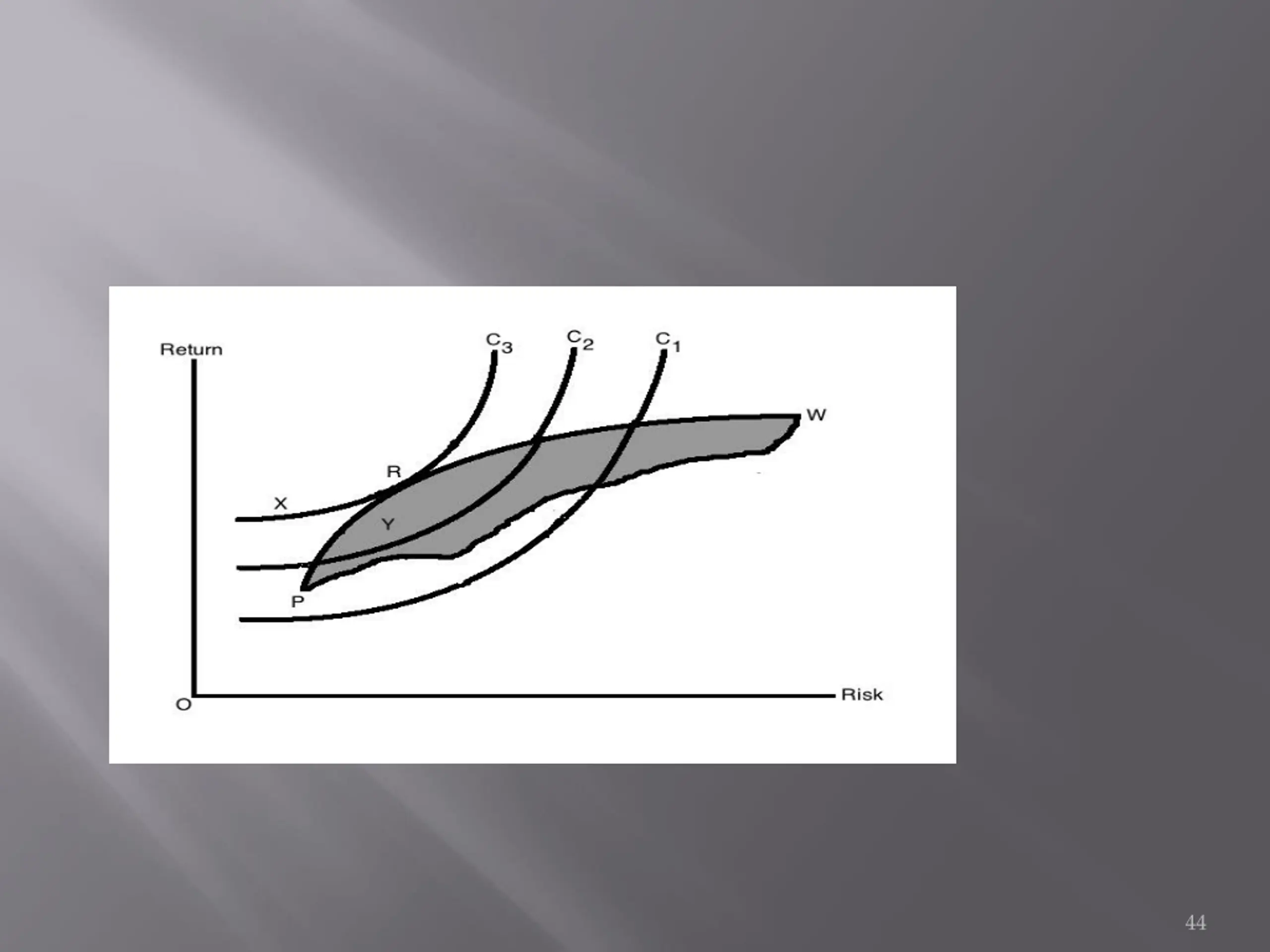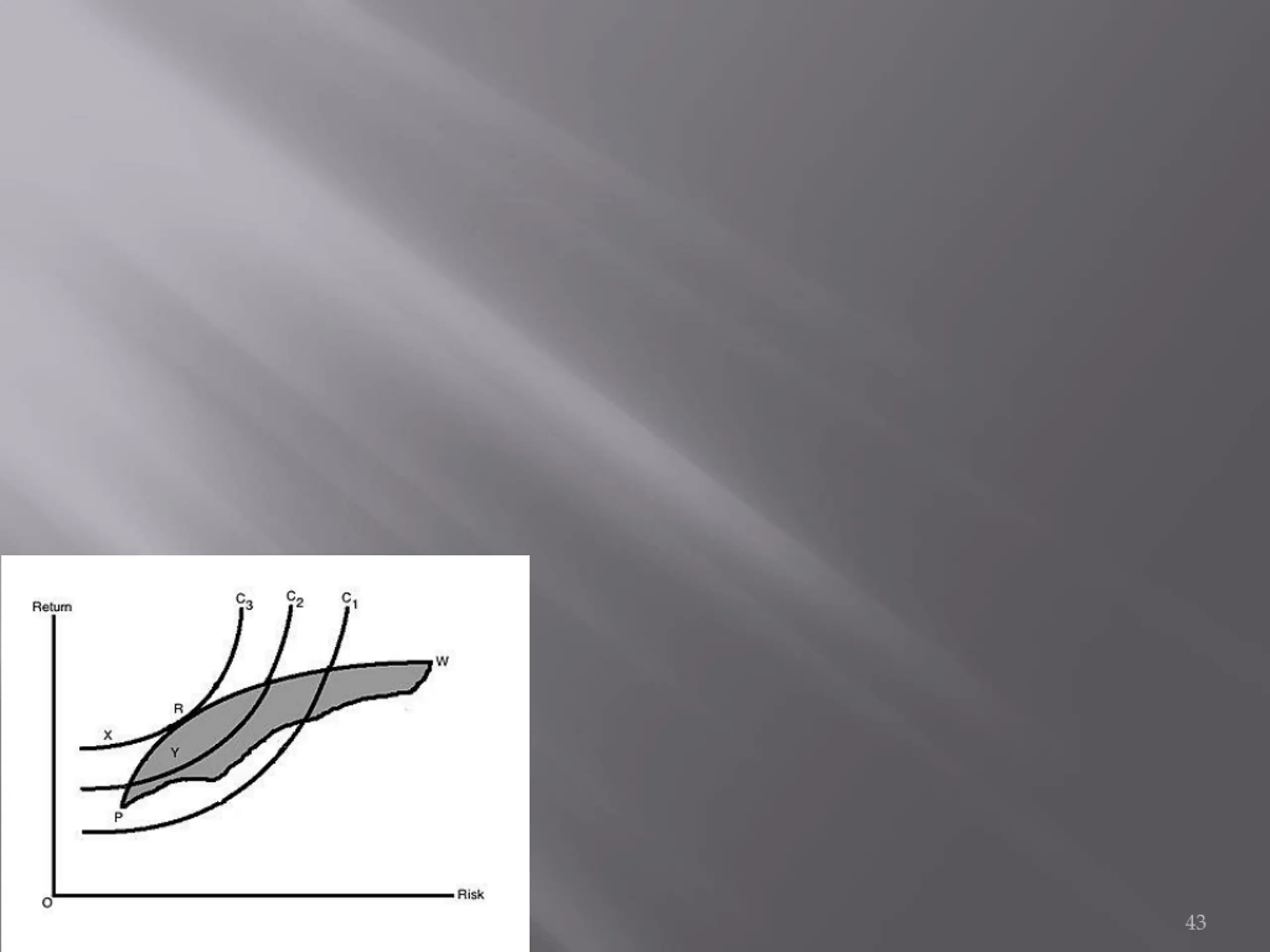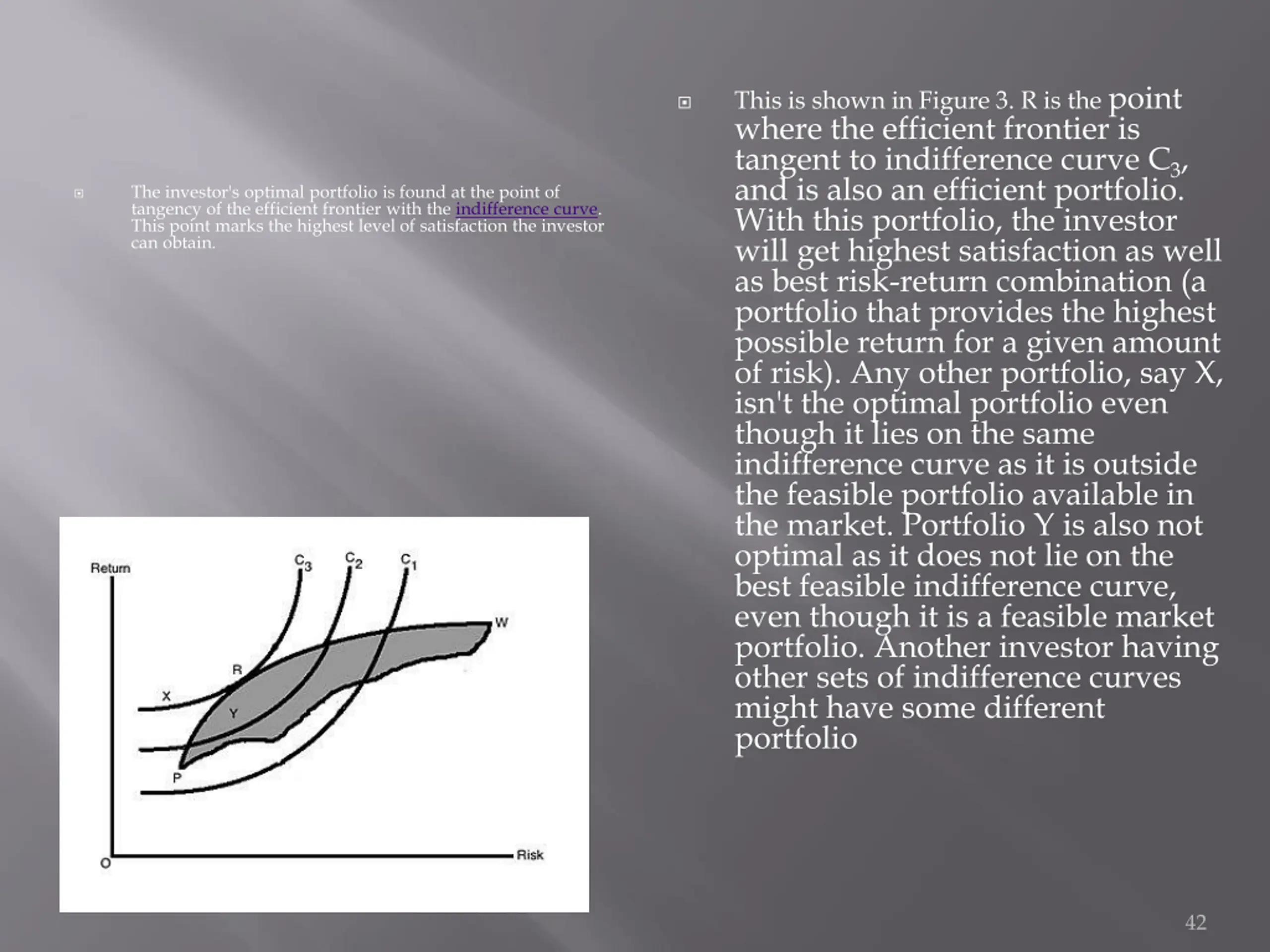 This is shown in Figure 3. R is the point where the efficient frontier is tangent to indifference curve C3, and is also an efficient portfolio. With this portfolio, the investor will get highest satisfaction as well as best risk-return combination (a portfolio that provides the highest possible return for a given amount of risk). Any other portfolio, say X, isn't the optimal portfolio even though it lies on the same indifference curve as it is outside the feasible portfolio available in the market. Portfolio Y is also not optimal as it does not lie on the best feasible indifference curve, even though it is a feasible market portfolio. Another investor having other sets of indifference curves might have some different portfolio The investor's optimal portfolio is found at the point of tangency of the efficient frontier with the indifference curve. This point marks the highest level of satisfaction the investor can obtain. 42