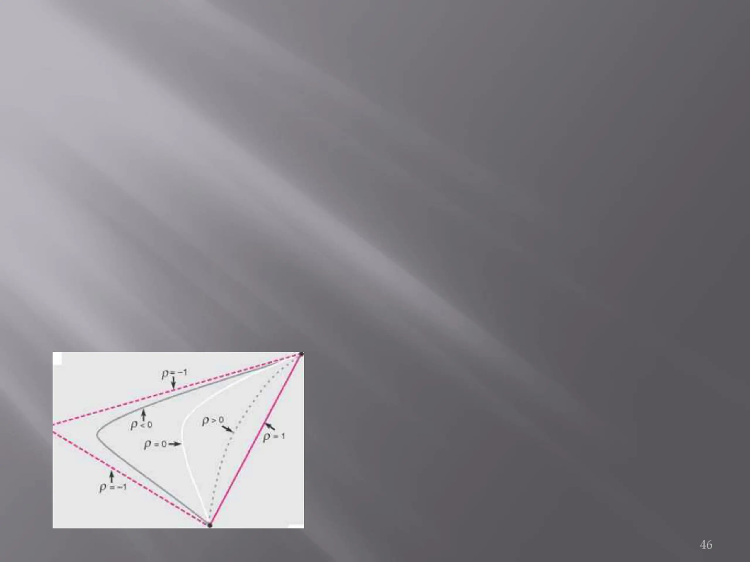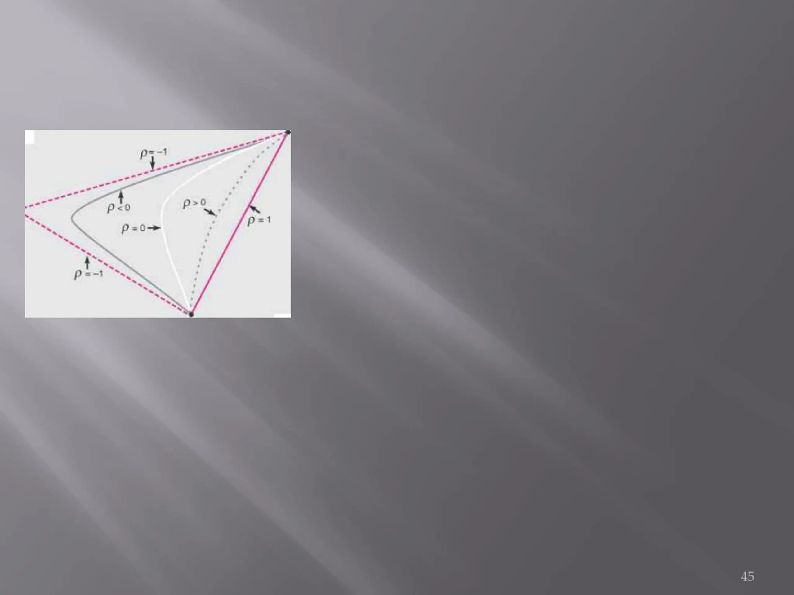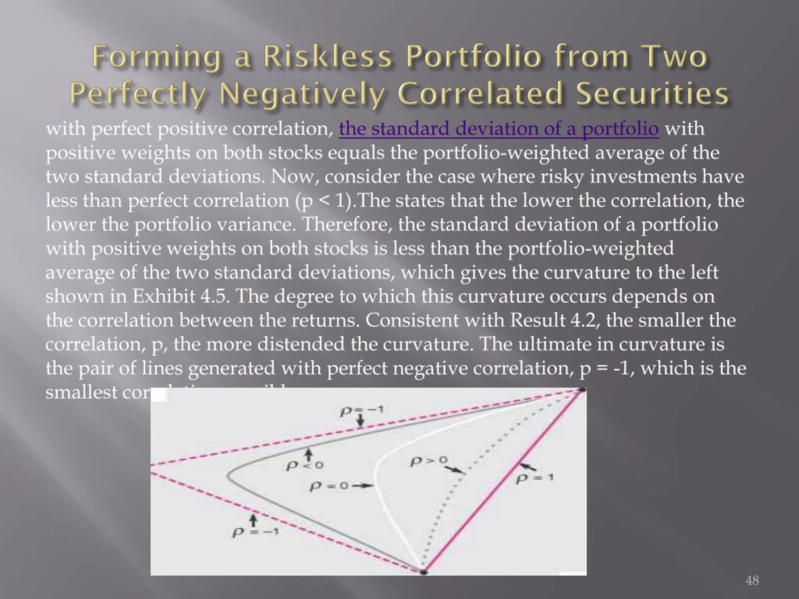 with perfect positive correlation, the standard deviation of a portfolio with positive weights on both stocks equals the portfolio-weighted average of the two standard deviations. Now, consider the case where risky investments have less than perfect correlation (p < 1).The states that the lower the correlation, the lower the portfolio variance. Therefore, the standard deviation of a portfolio with positive weights on both stocks is less than the portfolio-weighted average of the two standard deviations, which gives the curvature to the left shown in Exhibit 4.5. The degree to which this curvature occurs depends on the correlation between the returns. Consistent with Result 4.2, the smaller the correlation, p, the more distended the curvature. The ultimate in curvature is the pair of lines generated with perfect negative correlation, p = -1, which is the smallest correlation possible. 48