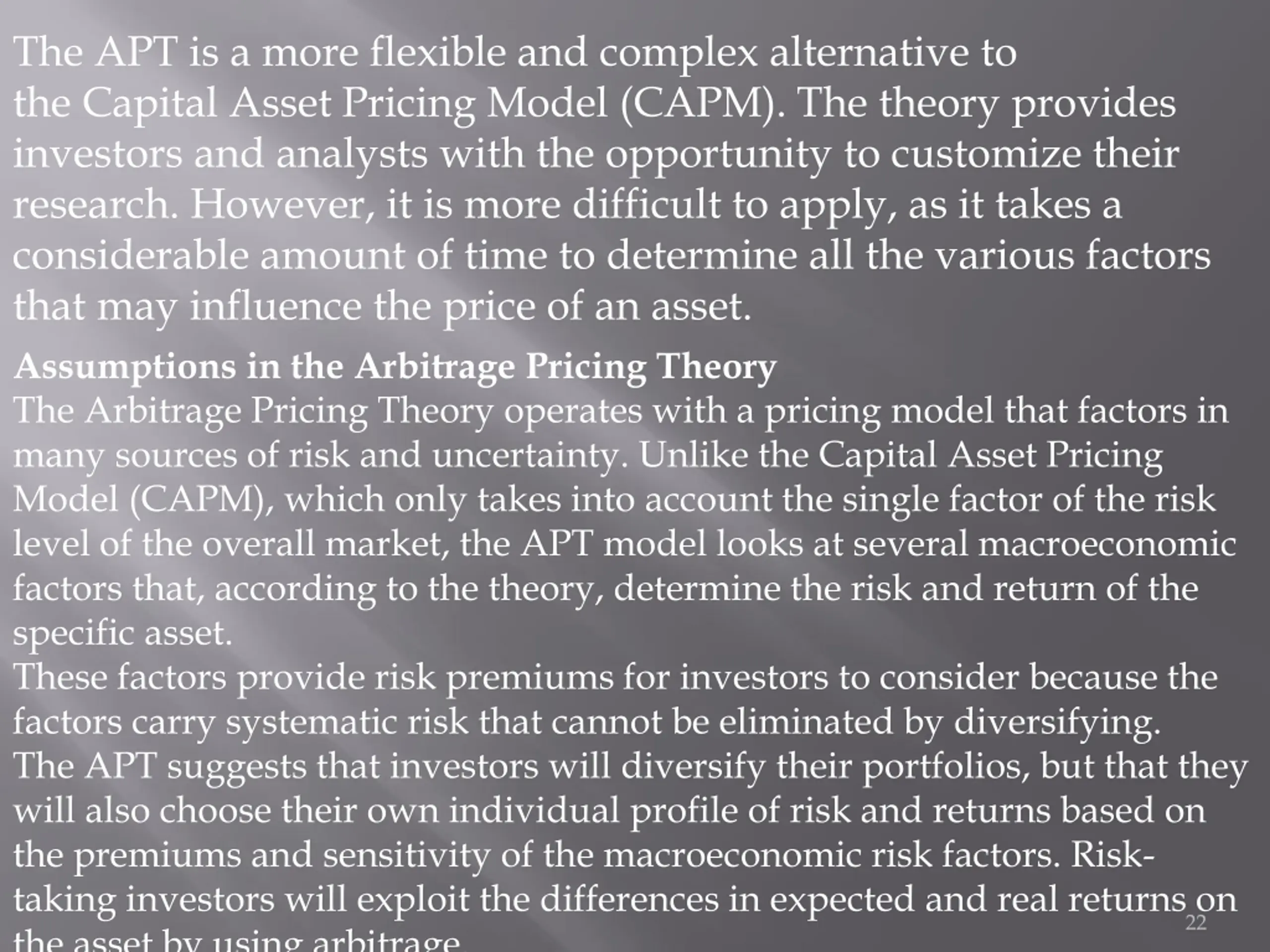 The APT is a more flexible and complex alternative to the Capital Asset Pricing Model (CAPM). The theory provides investors and analysts with the opportunity to customize their research. However, it is more difficult to apply, as it takes a considerable amount of time to determine all the various factors that may influence the price of an asset. Assumptions in the Arbitrage Pricing Theory The Arbitrage Pricing Theory operates with a pricing model that factors in many sources of risk and uncertainty. Unlike the Capital Asset Pricing Model (CAPM), which only takes into account the single factor of the risk level of the overall market, the APT model looks at several macroeconomic factors that, according to the theory, determine the risk and return of the specific asset. These factors provide risk premiums for investors to consider because the factors carry systematic risk that cannot be eliminated by diversifying. The APT suggests that investors will diversify their portfolios, but that they will also choose their own individual profile of risk and returns based on the premiums and sensitivity of the macroeconomic risk factors. Risk- taking investors will exploit the differences in expected and real returns on the asset by using arbitrage. 22
