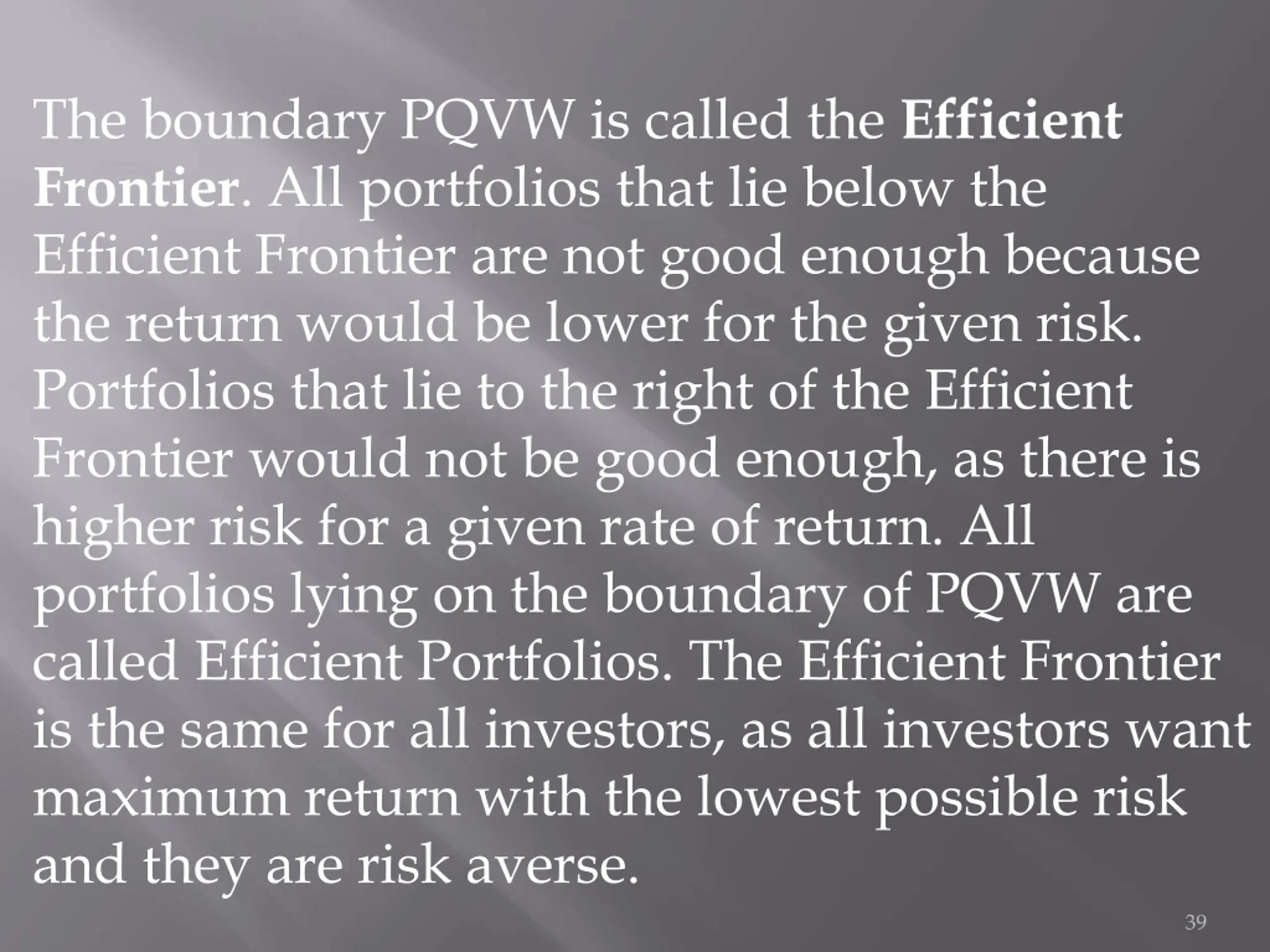 The boundary PQVW is called the Efficient Frontier. All portfolios that lie below the Efficient Frontier are not good enough because the return would be lower for the given risk. Portfolios that lie to the right of the Efficient Frontier would not be good enough, as there is higher risk for a given rate of return. All portfolios lying on the boundary of PQVW are called Efficient Portfolios. The Efficient Frontier is the same for all investors, as all investors want maximum return with the lowest possible risk and they are risk averse. 39