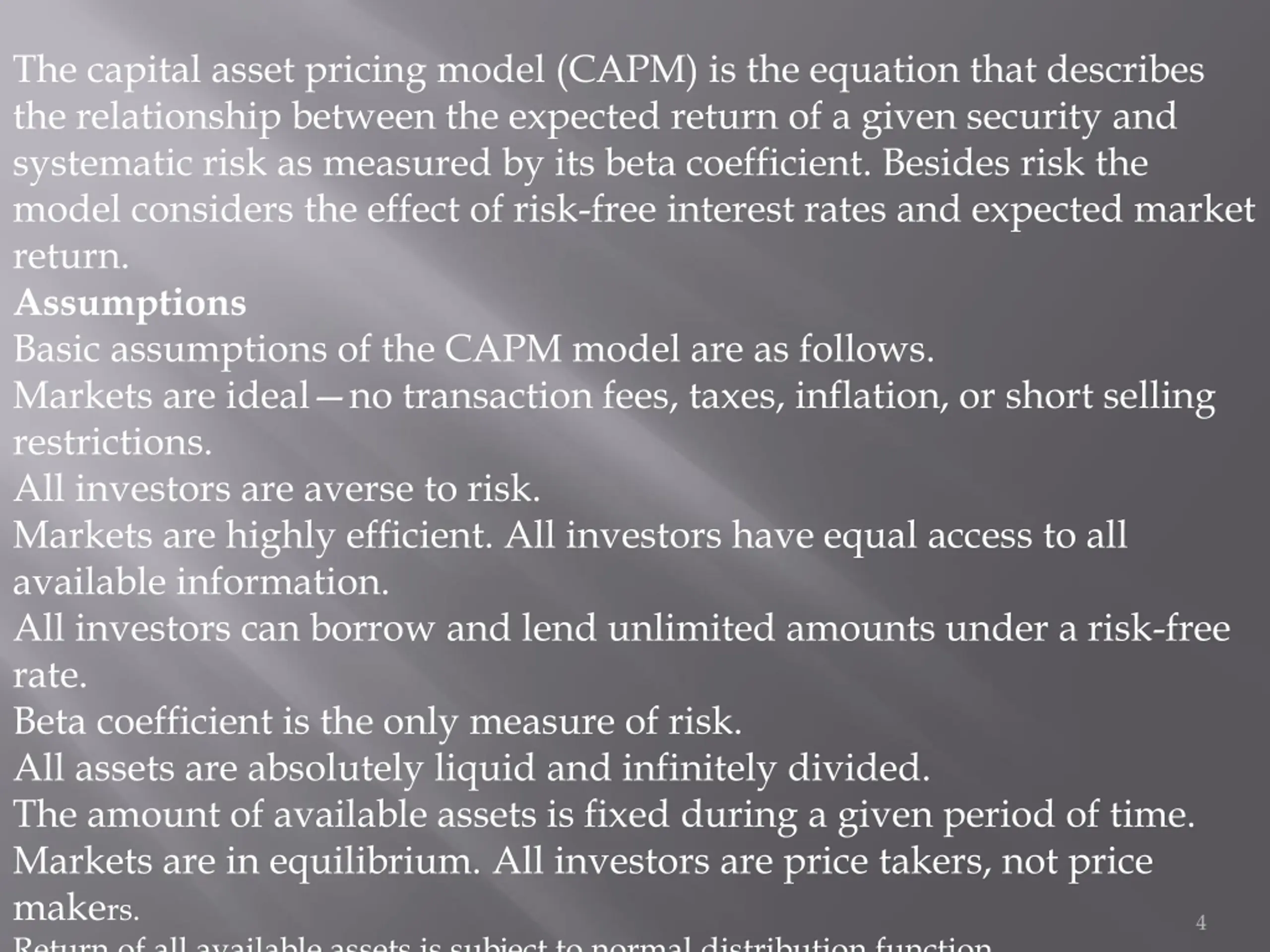 The capital asset pricing model (CAPM) is the equation that describes the relationship between the expected return of a given security and systematic risk as measured by its beta coefficient. Besides risk the model considers the effect of risk-free interest rates and expected market return. Assumptions Basic assumptions of the CAPM model are as follows. Markets are ideal no transaction fees, taxes, inflation, or short selling restrictions. All investors are averse to risk. Markets are highly efficient. All investors have equal access to all available information. All investors can borrow and lend unlimited amounts under a risk-free rate. Beta coefficient is the only measure of risk. All assets are absolutely liquid and infinitely divided. The amount of available assets is fixed during a given period of time. Markets are in equilibrium. All investors are price takers, not price makers. Return of all available assets is subject to normal distribution function. 4