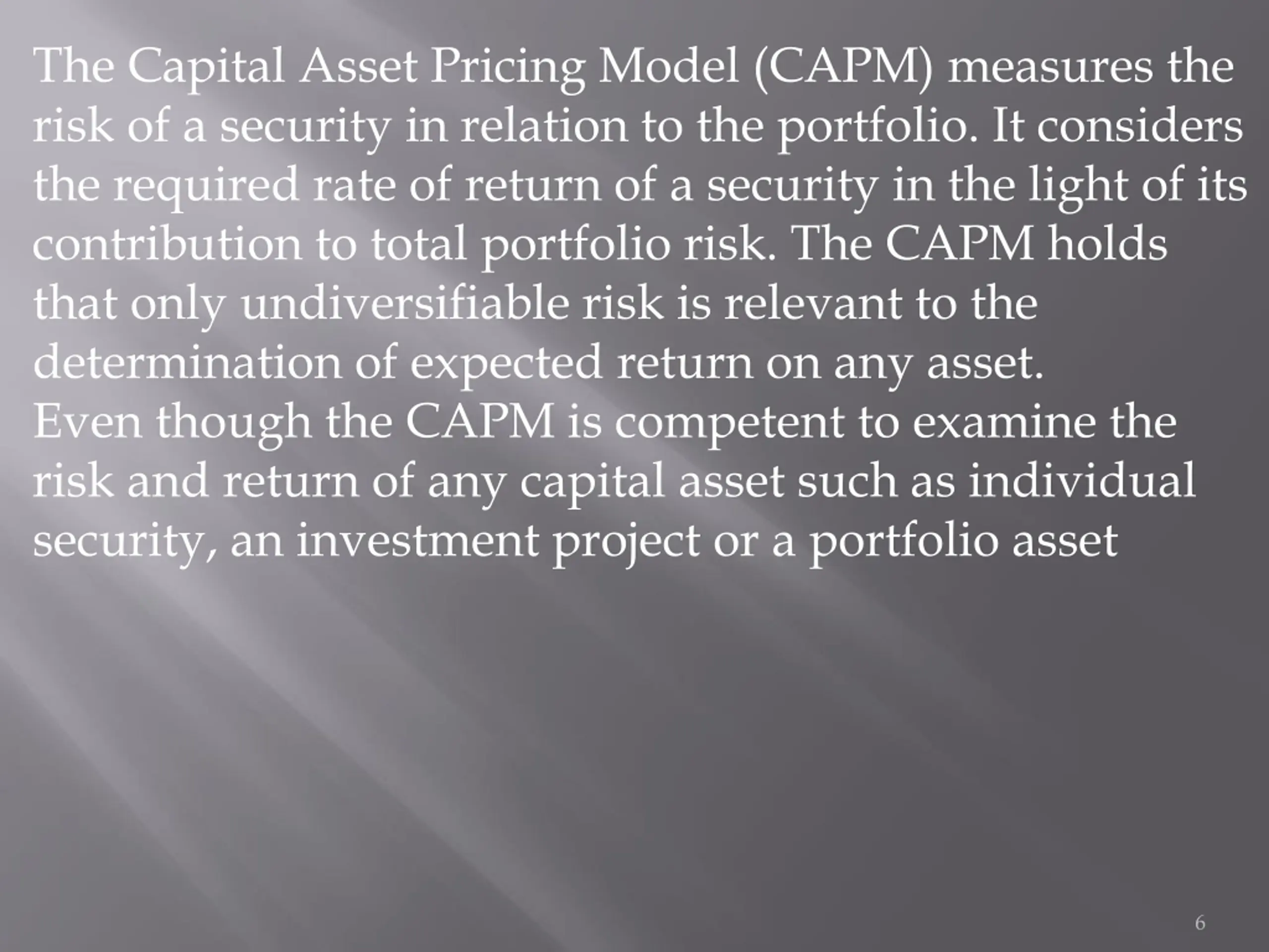 The Capital Asset Pricing Model (CAPM) measures the risk of a security in relation to the portfolio. It considers the required rate of return of a security in the light of its contribution to total portfolio risk. The CAPM holds that only undiversifiable risk is relevant to the determination of expected return on any asset. Even though the CAPM is competent to examine the risk and return of any capital asset such as individual security, an investment project or a portfolio asset 6