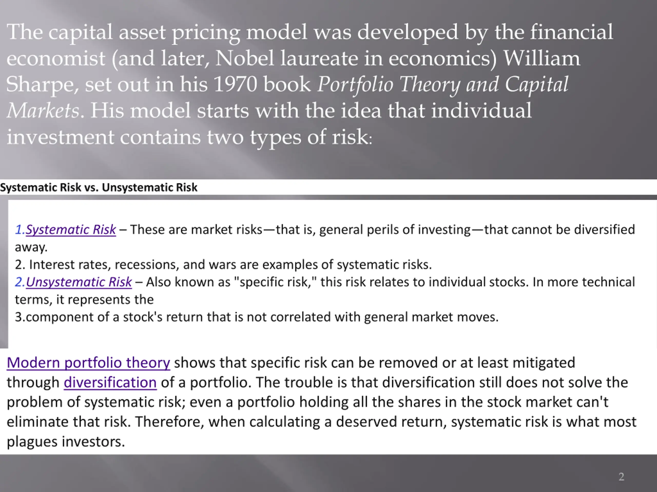 The capital asset pricing model was developed by the financial economist (and later, Nobel laureate in economics) William Sharpe, set out in his 1970 book Portfolio Theory and Capital Markets. His model starts with the idea that individual investment contains two types of risk: Systematic Risk vs. Unsystematic Risk 1.Systematic Risk These are market risks that is, general perils of investing that cannot be diversified away. 2. Interest rates, recessions, and wars are examples of systematic risks. 2.Unsystematic Risk Also known as "specific risk," this risk relates to individual stocks. In more technical terms, it represents the 3.component of a stock's return that is not correlated with general market moves. Modern portfolio theory shows that specific risk can be removed or at least mitigated through diversification of a portfolio. The trouble is that diversification still does not solve the problem of systematic risk; even a portfolio holding all the shares in the stock market can't eliminate that risk. Therefore, when calculating a deserved return, systematic risk is what most plagues investors. 2