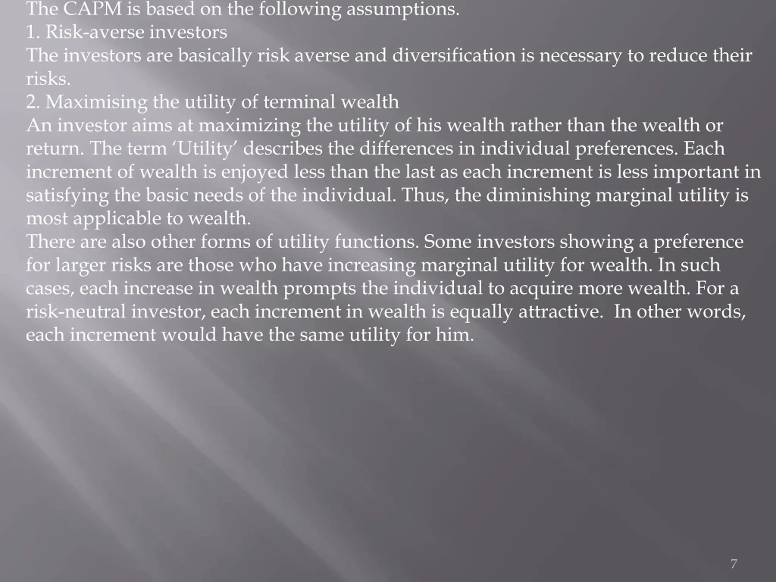 The CAPM is based on the following assumptions. 1. Risk-averse investors The investors are basically risk averse and diversification is necessary to reduce their risks. 2. Maximising the utility of terminal wealth An investor aims at maximizing the utility of his wealth rather than the wealth or return. The term Utility describes the differences in individual preferences. Each increment of wealth is enjoyed less than the last as each increment is less important in satisfying the basic needs of the individual. Thus, the diminishing marginal utility is most applicable to wealth. There are also other forms of utility functions. Some investors showing a preference for larger risks are those who have increasing marginal utility for wealth. In such cases, each increase in wealth prompts the individual to acquire more wealth. For a risk-neutral investor, each increment in wealth is equally attractive. In other words, each increment would have the same utility for him. 7