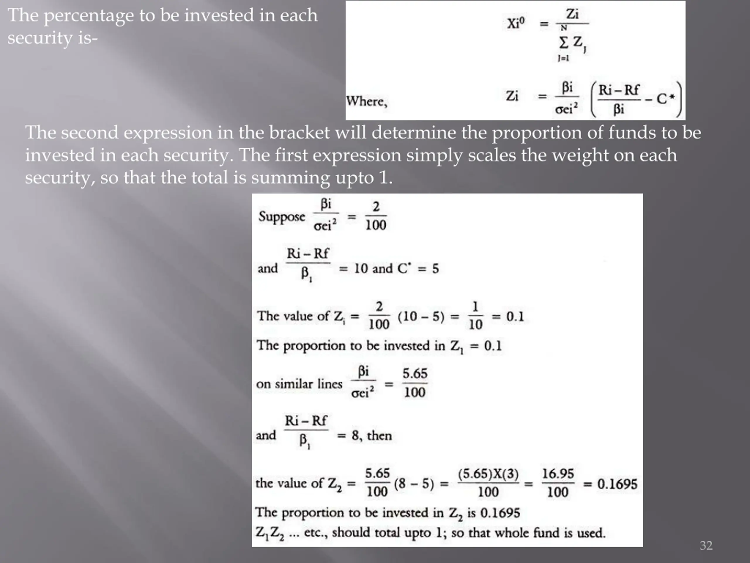 The percentage to be invested in each security is- The second expression in the bracket will determine the proportion of funds to be invested in each security. The first expression simply scales the weight on each security, so that the total is summing upto 1. 32