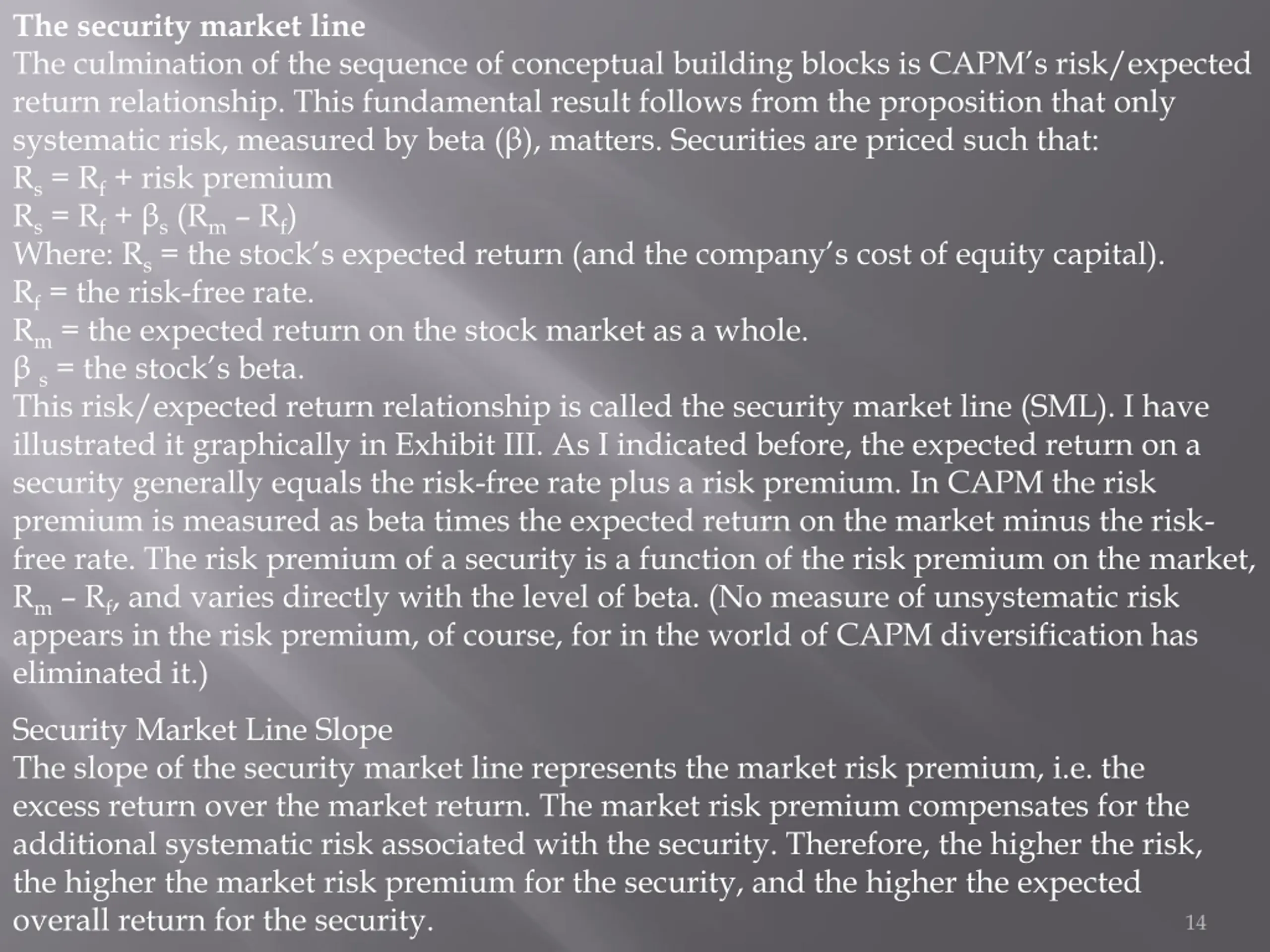 The security market line The culmination of the sequence of conceptual building blocks is CAPM s risk/expected return relationship. This fundamental result follows from the proposition that only systematic risk, measured by beta ( ), matters. Securities are priced such that: Rs= Rf+ risk premium Rs= Rf+ s(Rm Rf) Where: Rs= the stock s expected return (and the company s cost of equity capital). Rf= the risk-free rate. Rm= the expected return on the stock market as a whole. s= the stock s beta. This risk/expected return relationship is called the security market line (SML). I have illustrated it graphically in Exhibit III. As I indicated before, the expected return on a security generally equals the risk-free rate plus a risk premium. In CAPM the risk premium is measured as beta times the expected return on the market minus the risk- free rate. The risk premium of a security is a function of the risk premium on the market, Rm Rf, and varies directly with the level of beta. (No measure of unsystematic risk appears in the risk premium, of course, for in the world of CAPM diversification has eliminated it.) Security Market Line Slope The slope of the security market line represents the market risk premium, i.e. the excess return over the market return. The market risk premium compensates for the additional systematic risk associated with the security. Therefore, the higher the risk, the higher the market risk premium for the security, and the higher the expected overall return for the security. 14