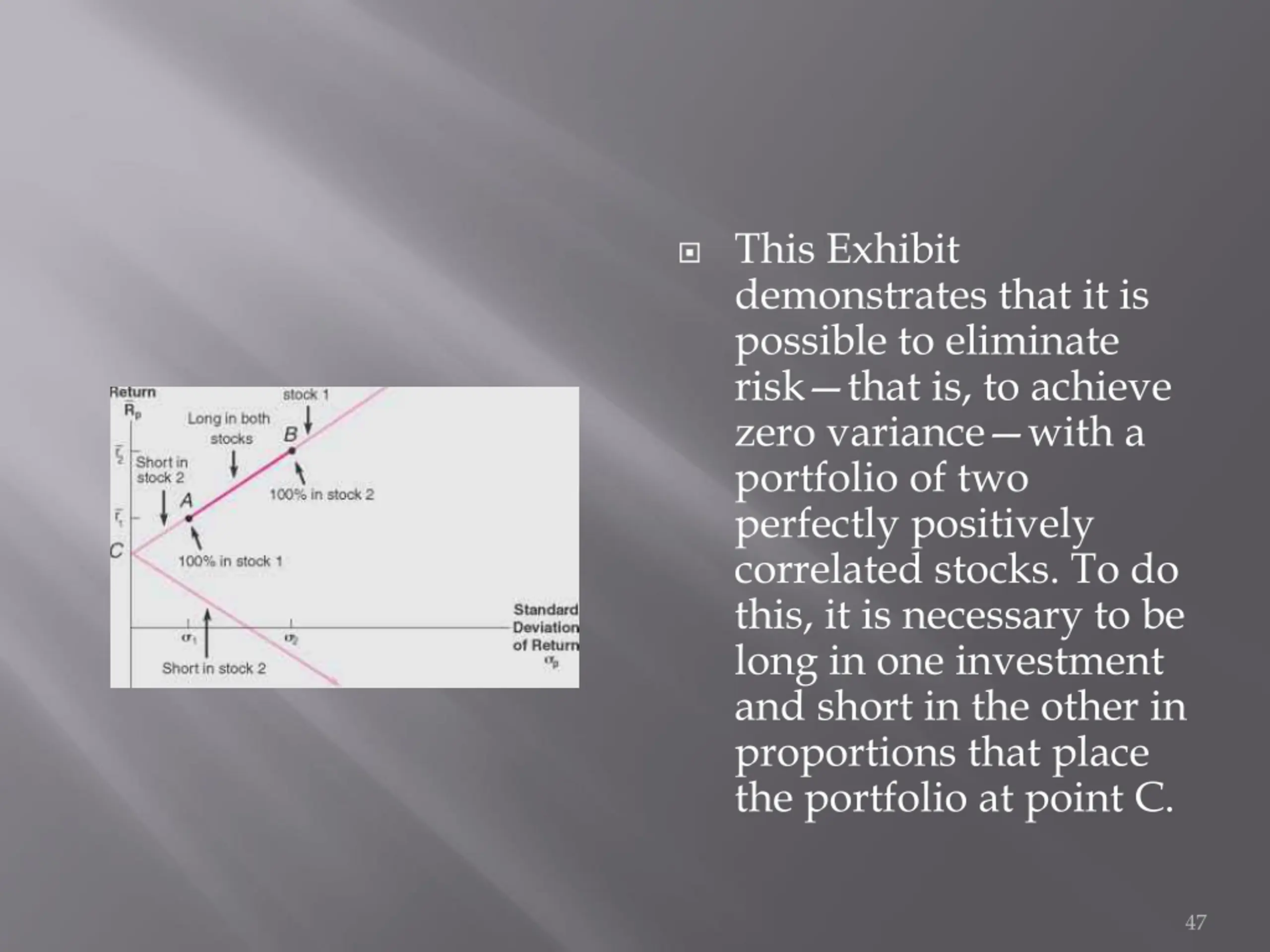 This Exhibit demonstrates that it is possible to eliminate risk that is, to achieve zero variance with a portfolio of two perfectly positively correlated stocks. To do this, it is necessary to be long in one investment and short in the other in proportions that place the portfolio at point C. 47