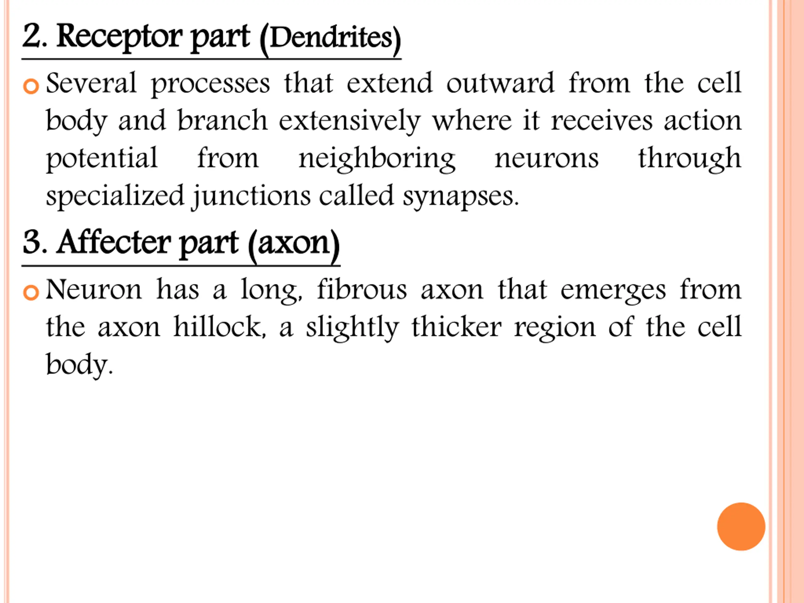 2 2. . Receptor Several processes that extend outward from the cell body and branch extensively where it receives action potential specialized junctions called synapses. 3. Neuron has a long, fibrous axon that emerges from the axon hillock, a slightly thicker region of the cell body. Receptor part part ( (Dendrites Dendrites) ) from neighboring neurons through 3. Affecter Affecter part (axon part (axon) )