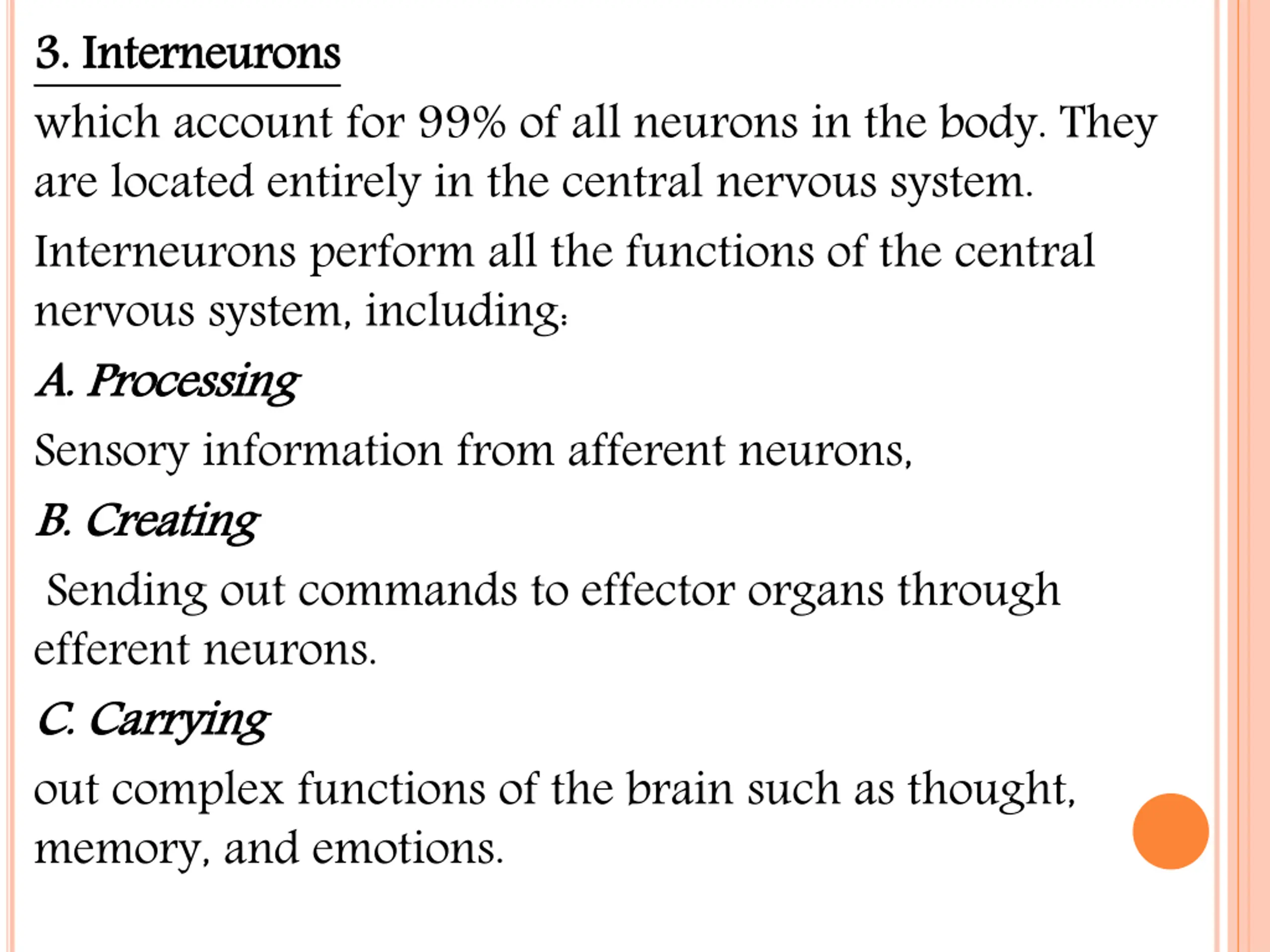 3. Interneurons which account for 99% of all neurons in the body. They are located entirely in the central nervous system. Interneurons perform all the functions of the central nervous system, including: A. Processing Sensory information from afferent neurons, B. Creating Sending out commands to effector organs through efferent neurons. C. Carrying out complex functions of the brain such as thought, memory, and emotions. 3. Interneurons A. Processing B. Creating C. Carrying