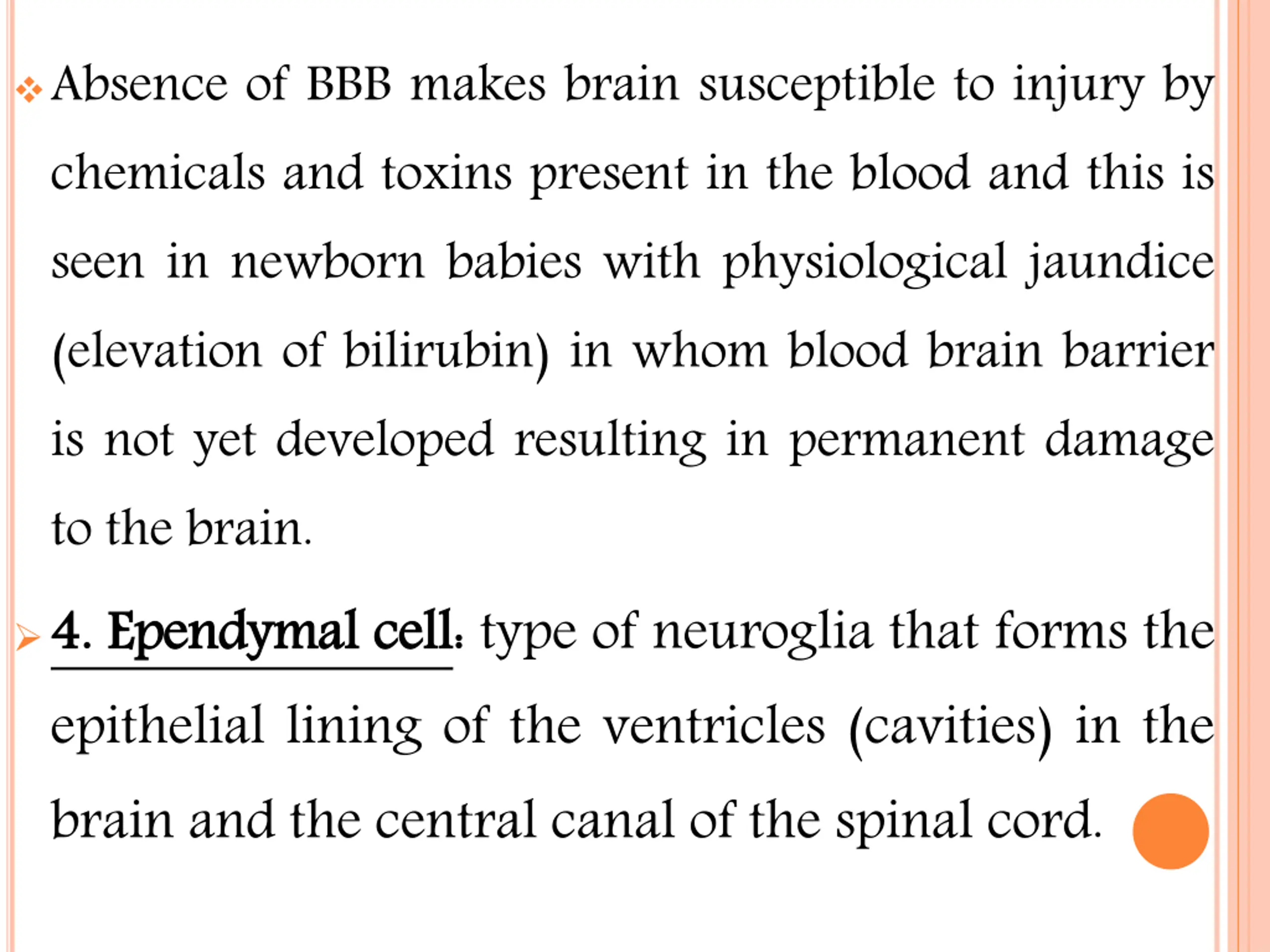 Absence of BBB makes brain susceptible to injury by chemicals and toxins present in the blood and this is seen in newborn babies with physiological jaundice (elevation of bilirubin) in whom blood brain barrier is not yet developed resulting in permanent damage to the brain. 4 4. . Ependymal epithelial lining of the ventricles (cavities) in the brain and the central canal of the spinal cord. Ependymal cell cell: : type of neuroglia that forms the