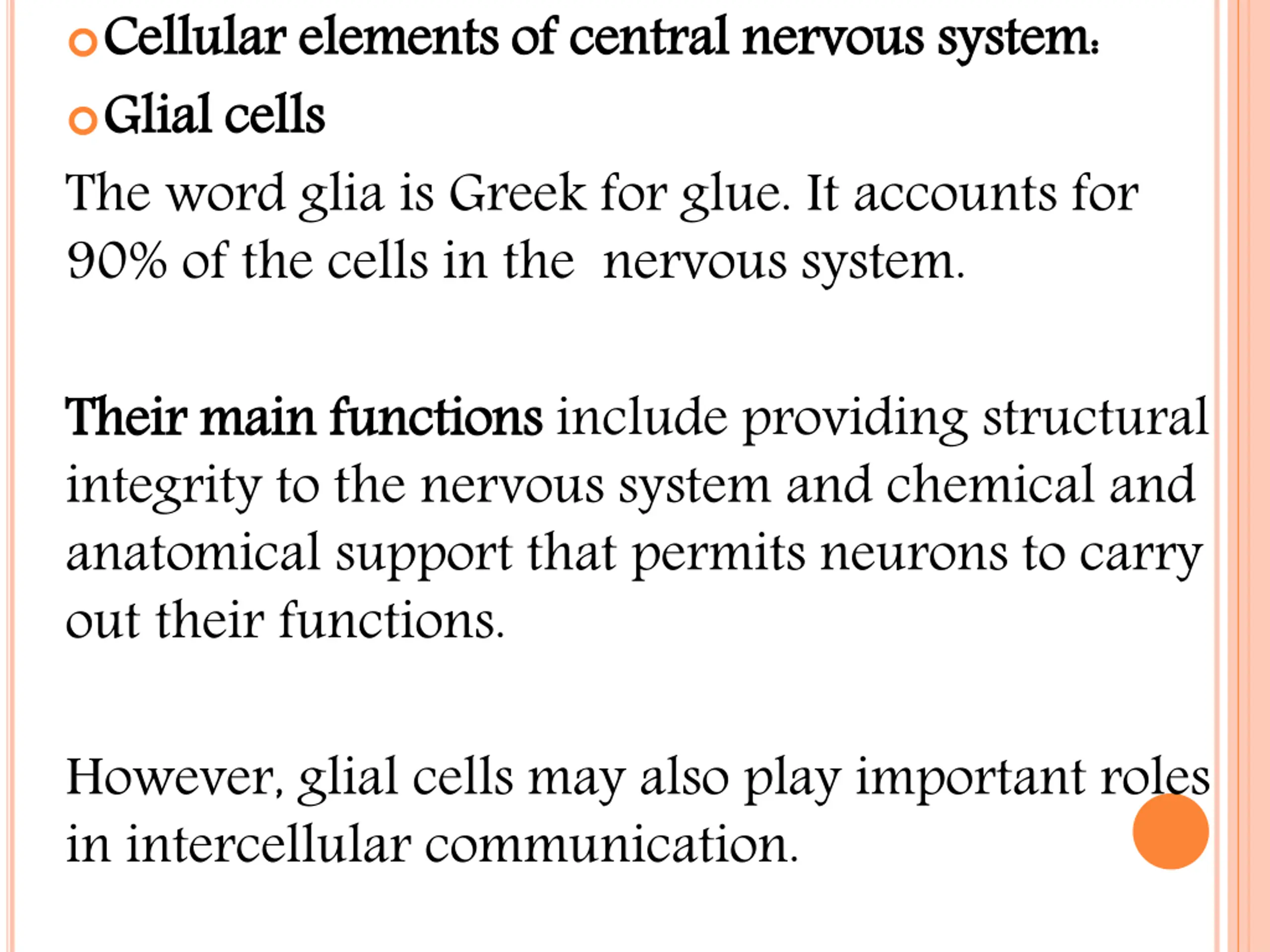 Cellular elements of central nervous system: Glial cells The word glia is Greek for glue. It accounts for 90% of the cells in the nervous system. Their main functions integrity to the nervous system and chemical and anatomical support that permits neurons to carry out their functions. Cellular elements of central nervous system: Glial cells Their main functions include providing structural However, glial cells may also play important roles in intercellular communication.