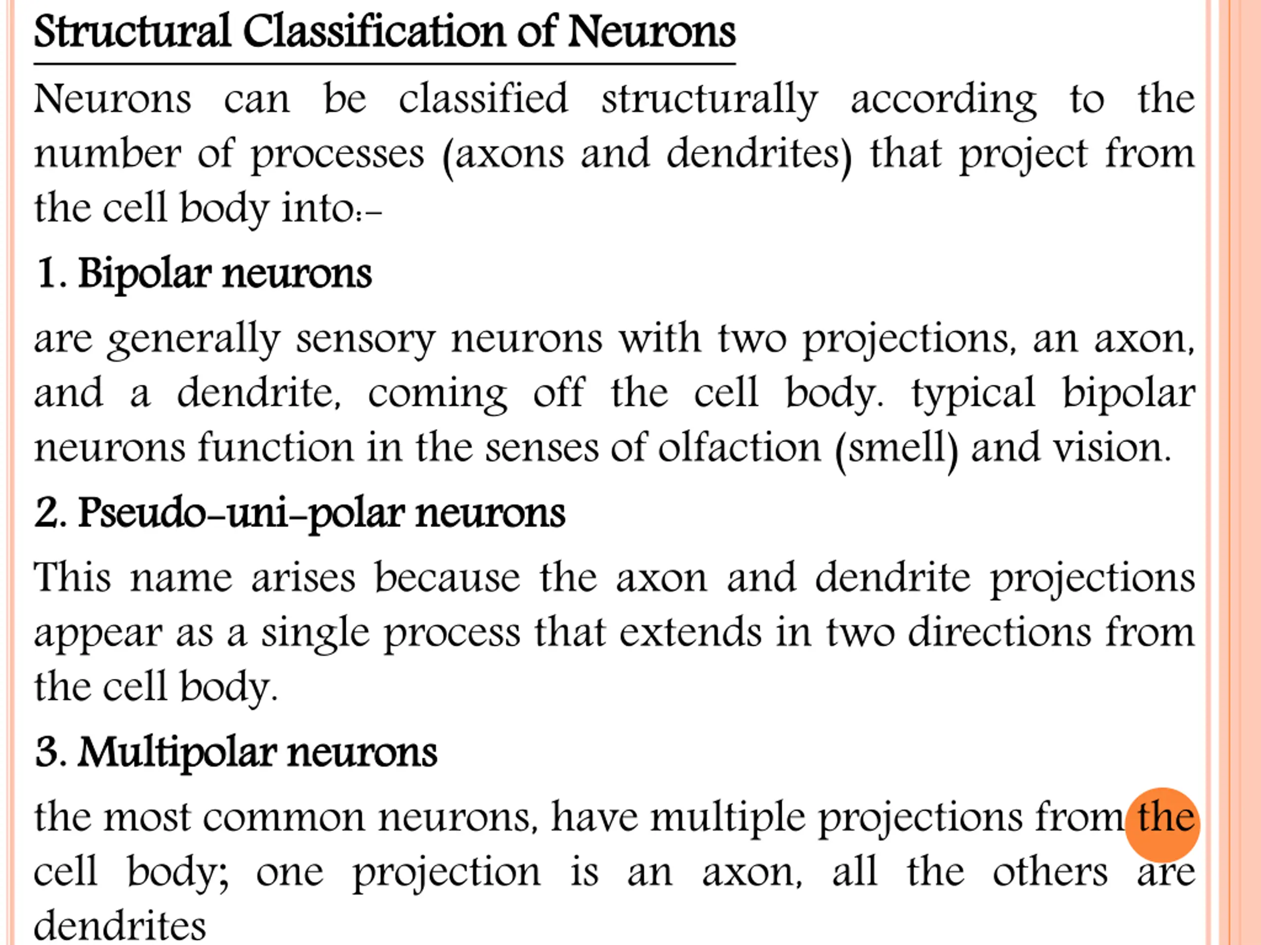 Structural Neurons can be classified structurally according to the number of processes (axons and dendrites) that project from the cell body into:- 1 1. . Bipolar are generally sensory neurons with two projections, an axon, and a dendrite, coming off the cell body. typical bipolar neurons function in the senses of olfaction (smell) and vision. 2 2. . Pseudo This name arises because the axon and dendrite projections appear as a single process that extends in two directions from the cell body. 3 3. . Multipolar the most common neurons, have multiple projections from the cell body; one projection is an axon, all the others are dendrites Structural Classification Classification of of Neurons Neurons Bipolar neurons neurons Pseudo- -uni uni- -polar polar neurons neurons Multipolar neurons neurons