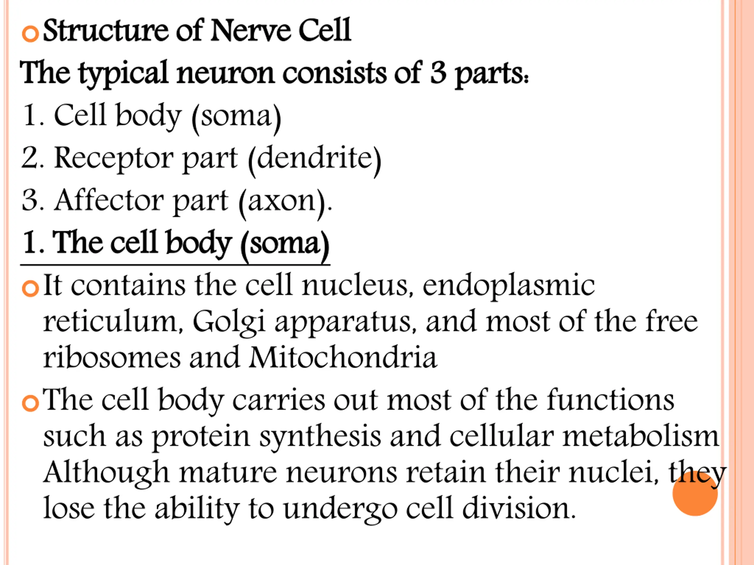Structure of The 1. Cell body (soma) 2. Receptor part (dendrite) 3. Affector part (axon). 1. The It contains the cell nucleus, endoplasmic reticulum, Golgi apparatus, and most of the free ribosomes and Mitochondria The cell body carries out most of the functions such as protein synthesis and cellular metabolism Although mature neurons retain their nuclei, they lose the ability to undergo cell division. Structure of N Nerve Cell The typical neuron consists of 3 erve Cell typical neuron consists of 3 parts: parts: 1. The cell body (soma) cell body (soma)